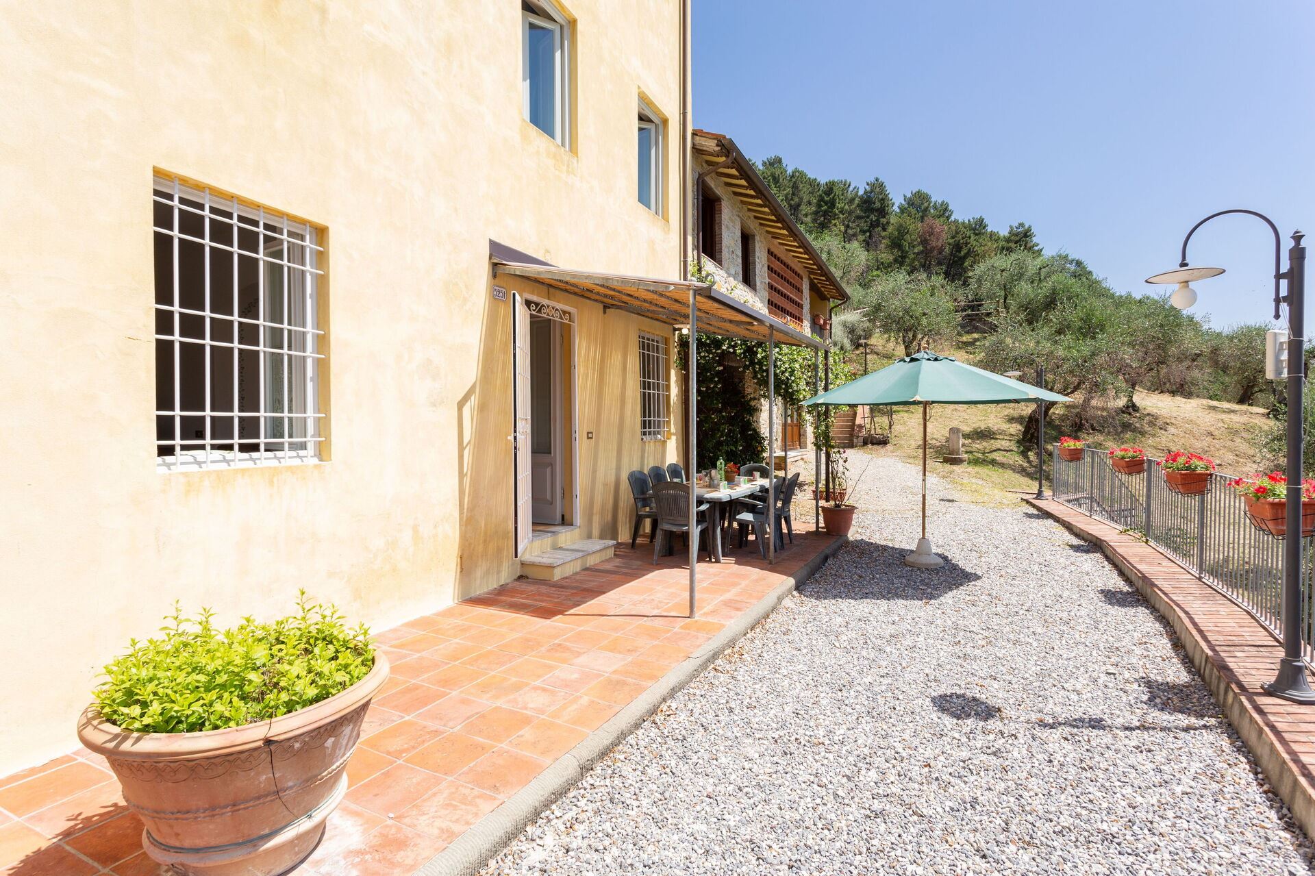 Feriebolig til 8 personer på landejendom med 3 lejligheder, pool og panoramaudsigt i bakkerne over Lucca (10 km) i det nordlige Toscana.