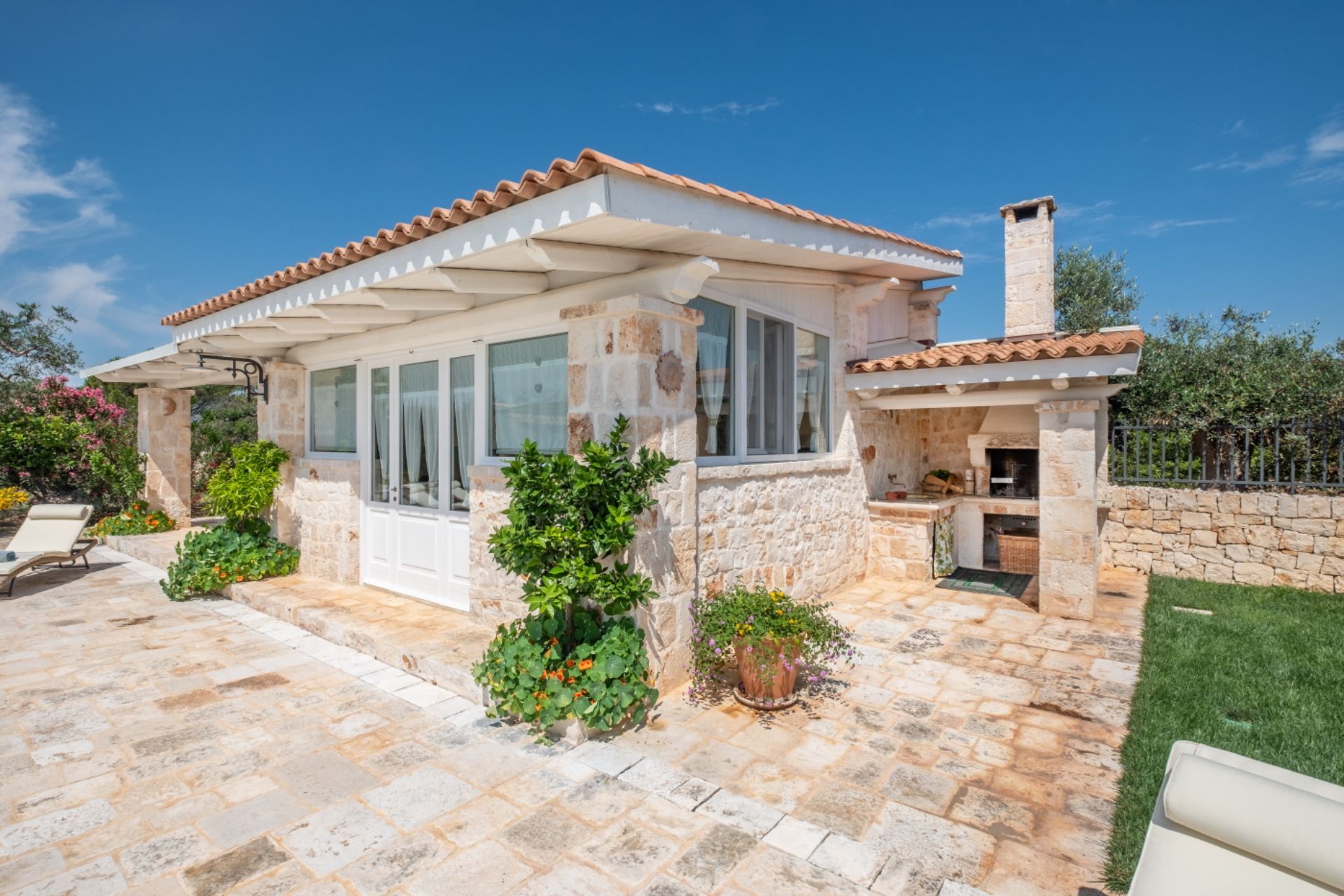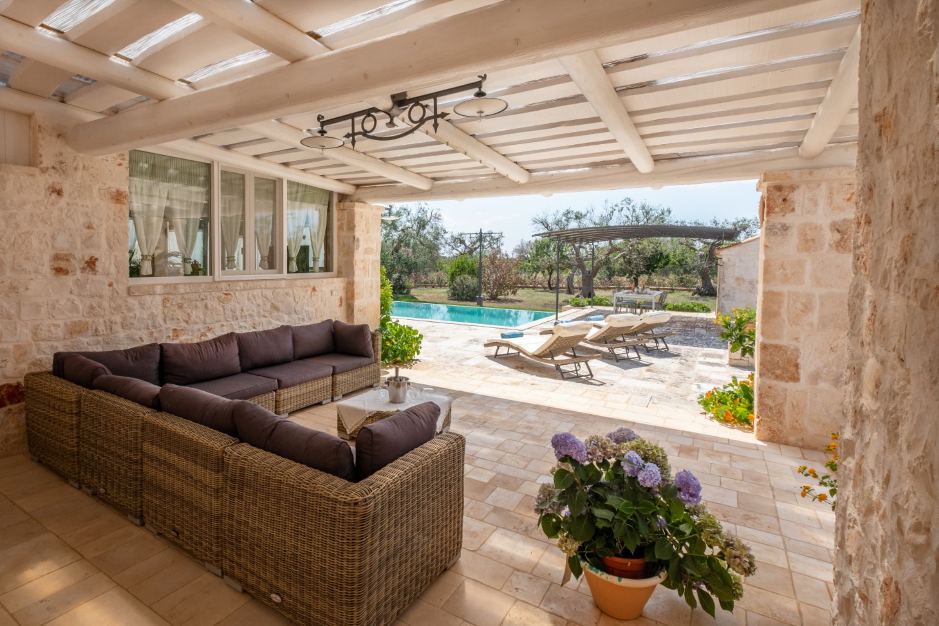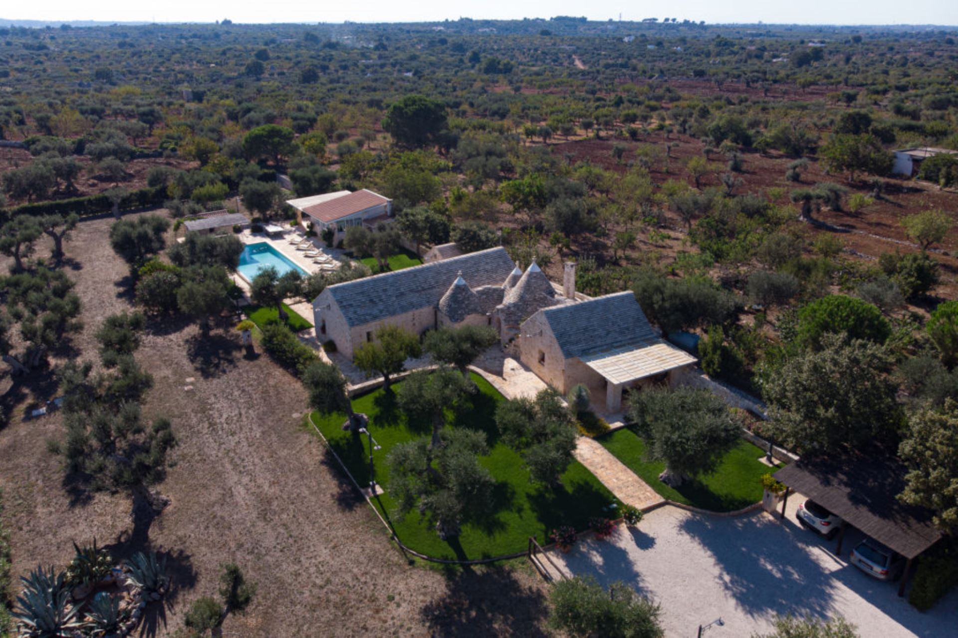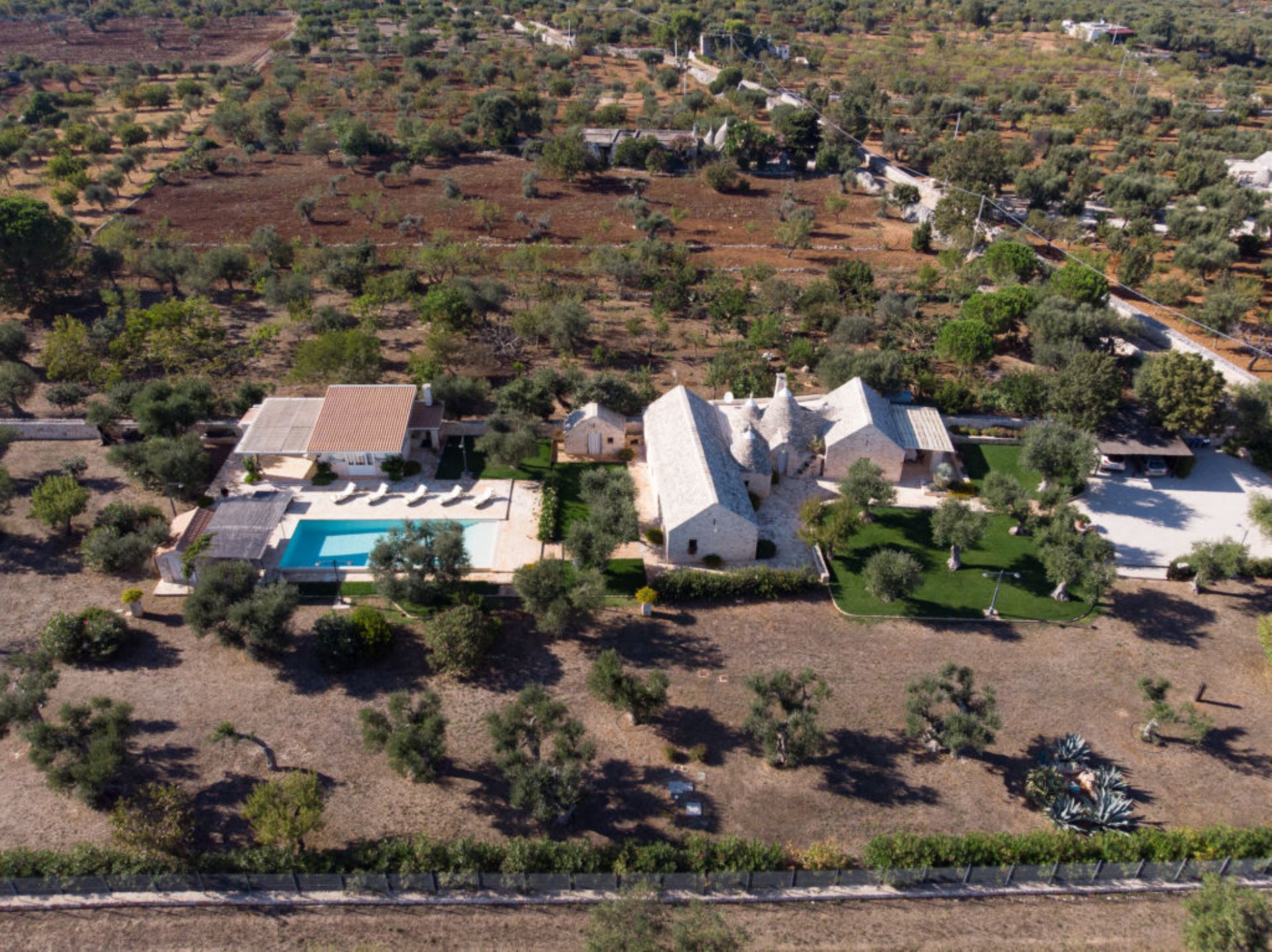 Landstedet ligger i en velplejet have omgivet af gamle oliventræer i et karakteristisk syditaliensk landskab med skove af gamle oliventræer, hvor hvide stensætninger omgiver de enkelte marker. Villaen har et stort udekøkken i en separat bygning ved poolen, flere gode terrasser og ikke mindst en stor pool på 80 kvadratmeter med liggestole.