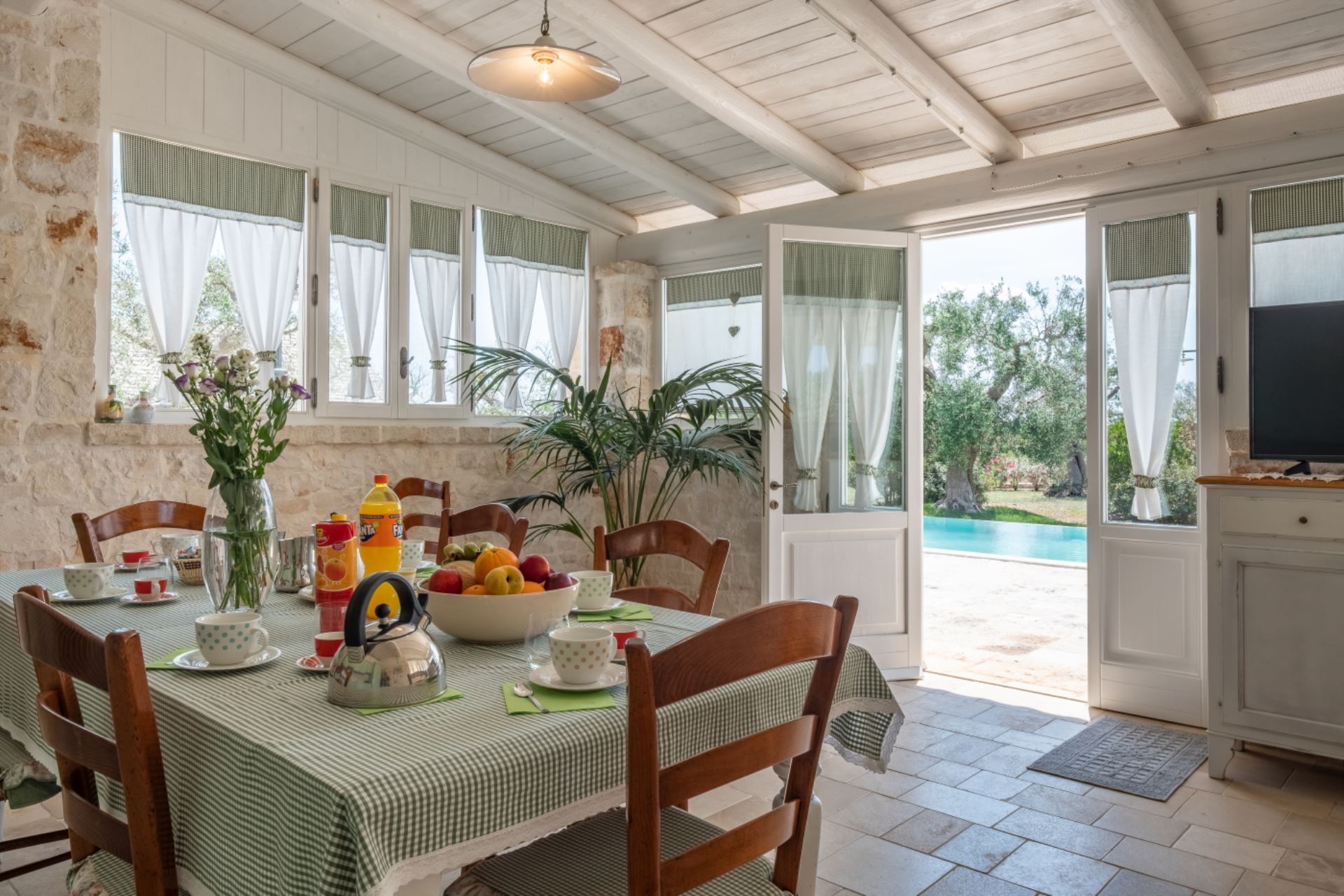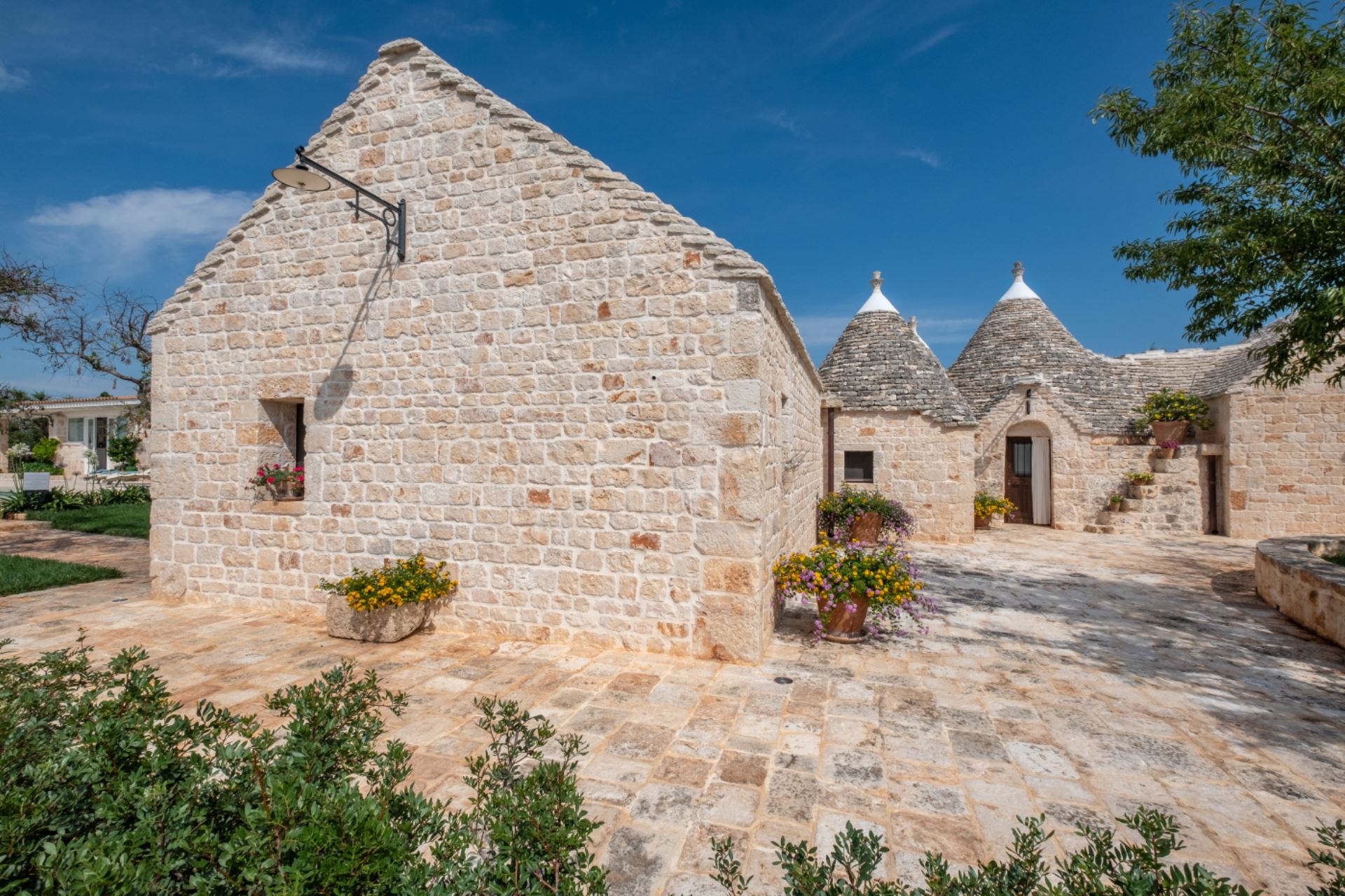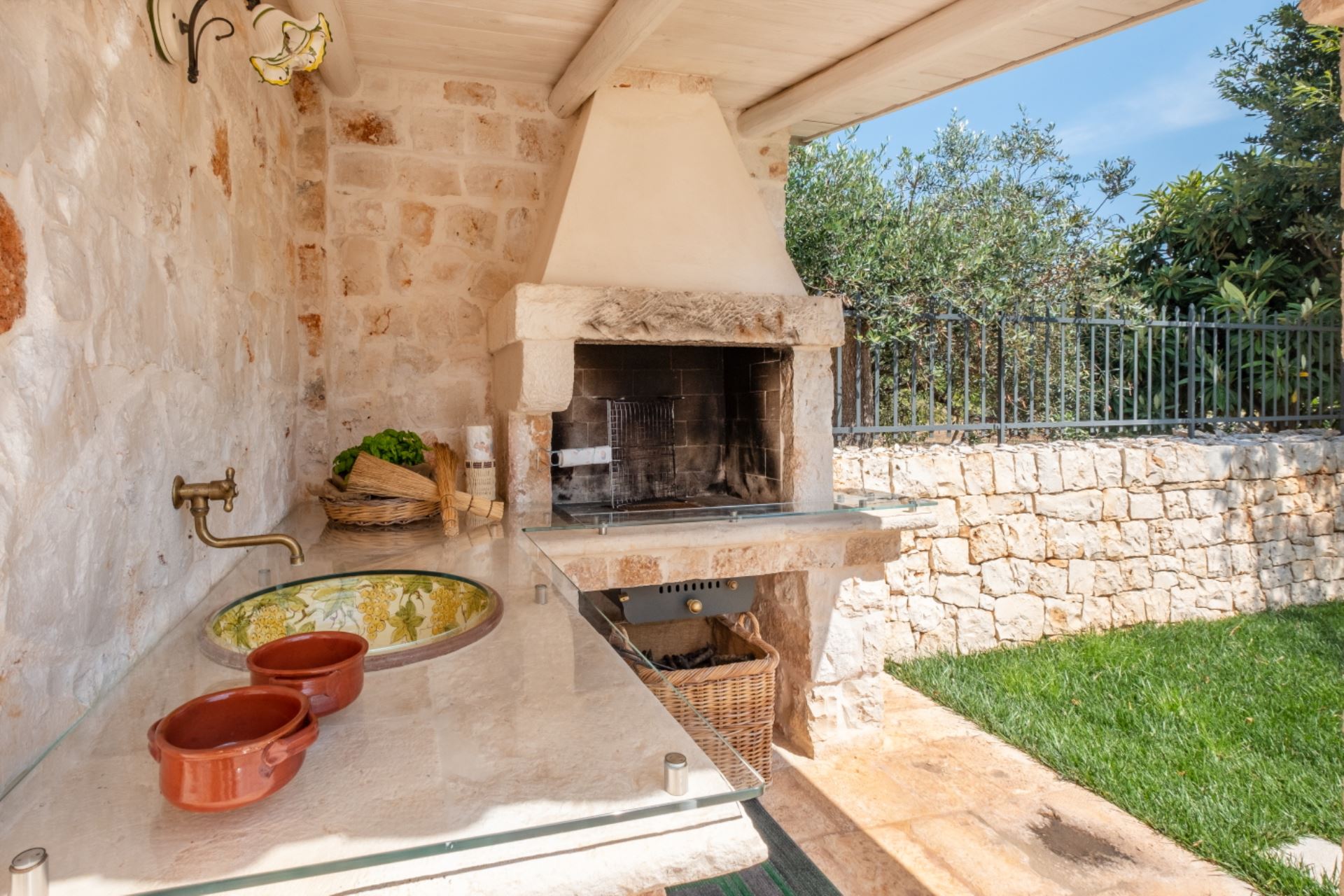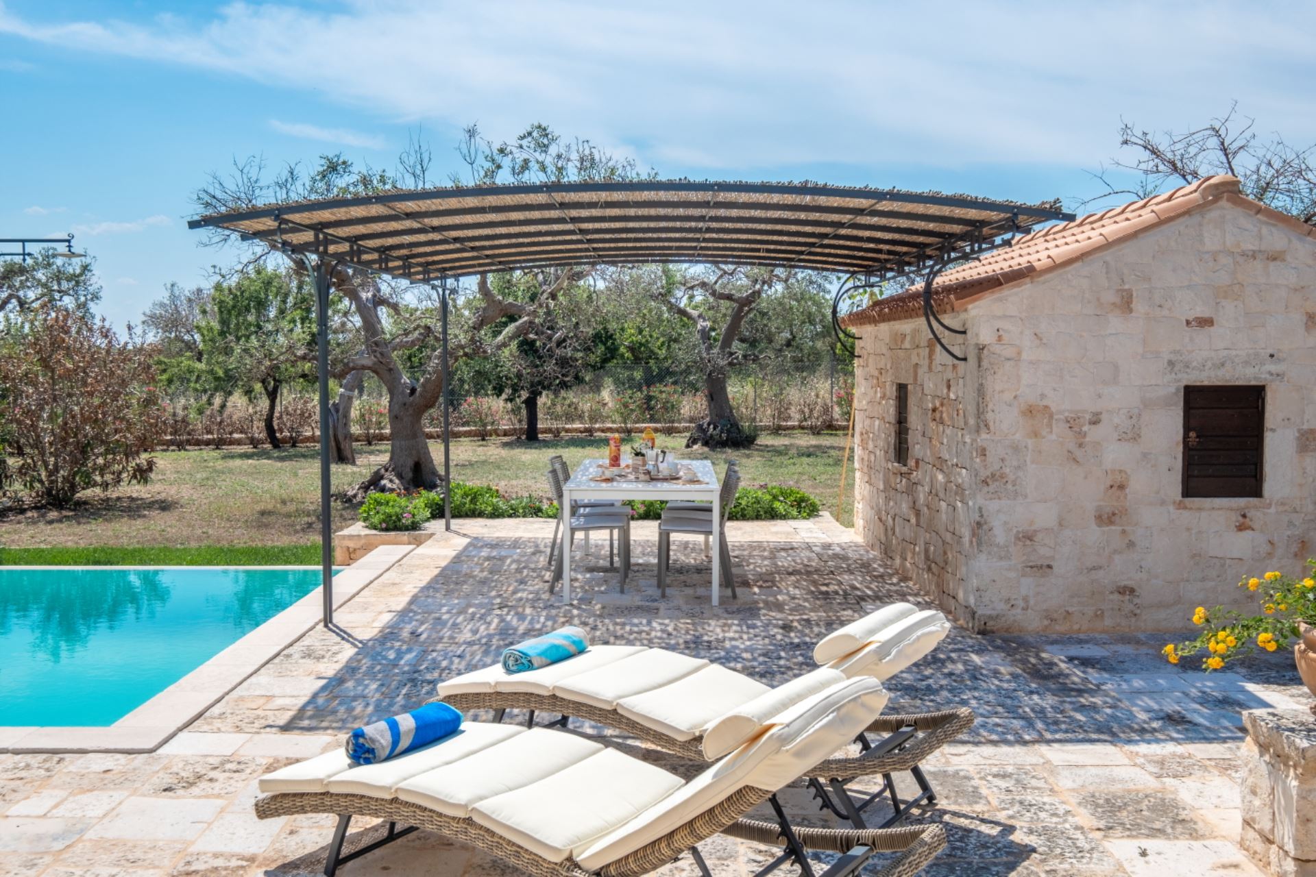 Landstedet ligger i en velplejet have omgivet af gamle oliventræer i et karakteristisk syditaliensk landskab med skove af gamle oliventræer, hvor hvide stensætninger omgiver de enkelte marker. Villaen har et stort udekøkken i en separat bygning ved poolen, flere gode terrasser og ikke mindst en stor pool på 80 kvadratmeter med liggestole.