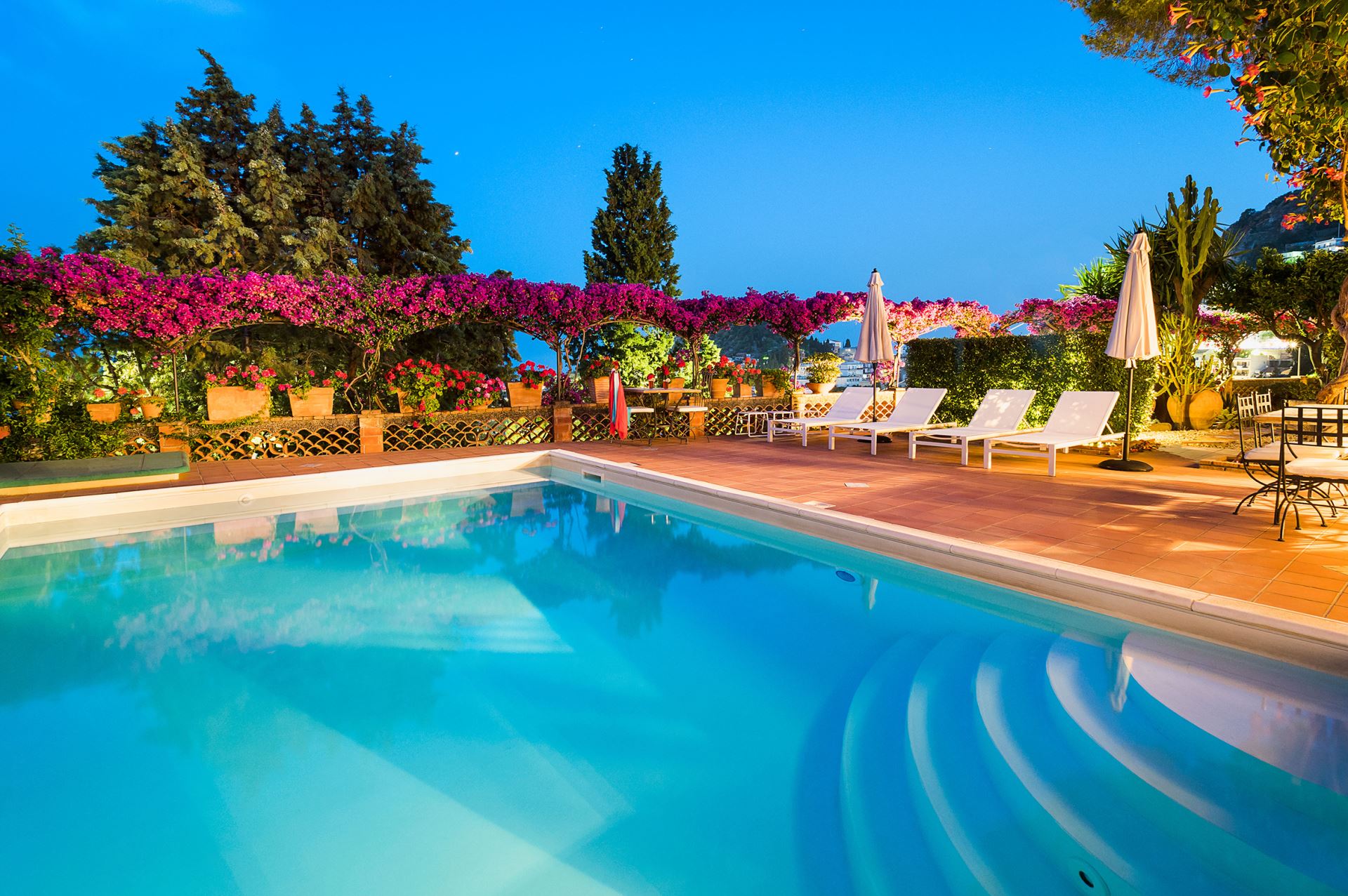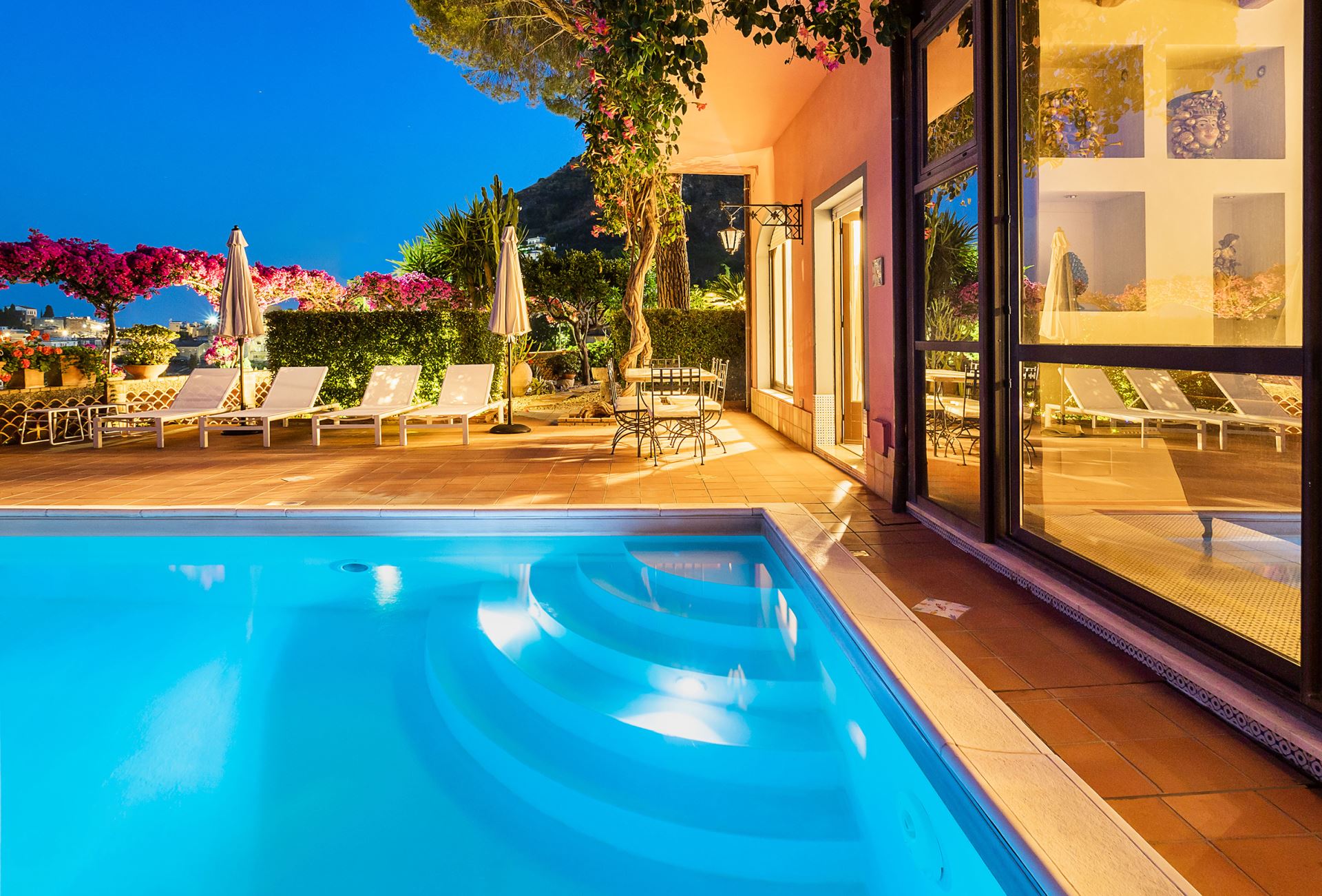 Villa Boheme råder og flere gode uderum og terrasser med god plads til at sidde uge og nyde de lune aftener og ikke mindst en direkte udgang til en privat pool.