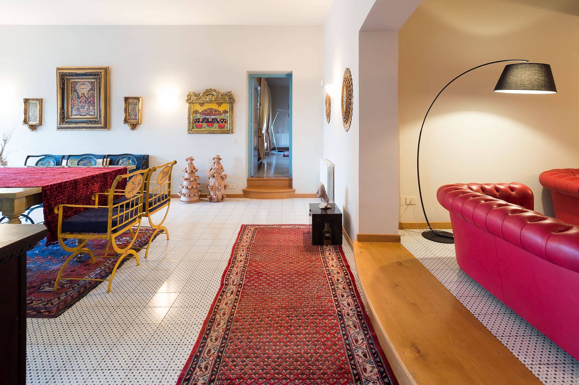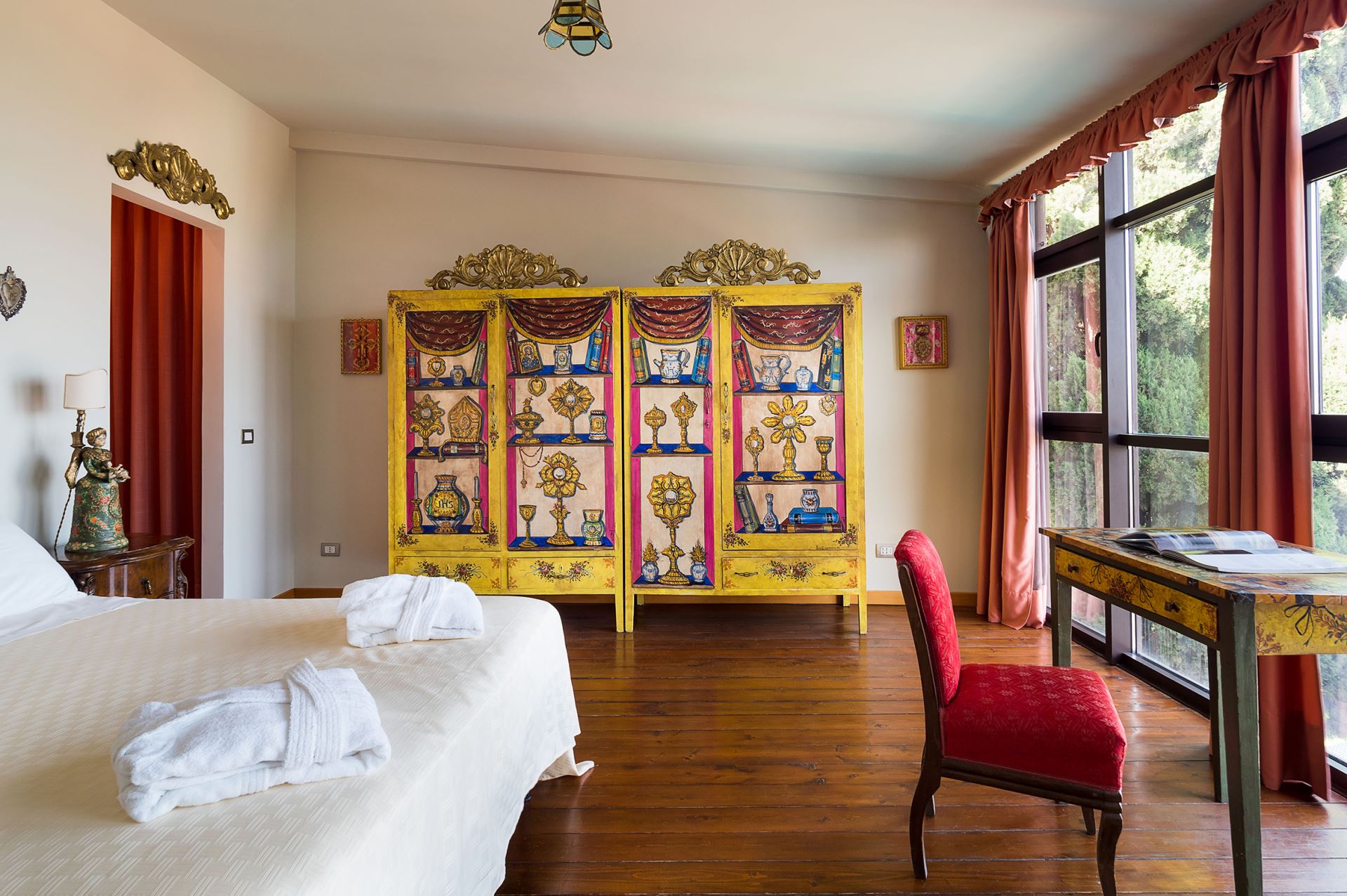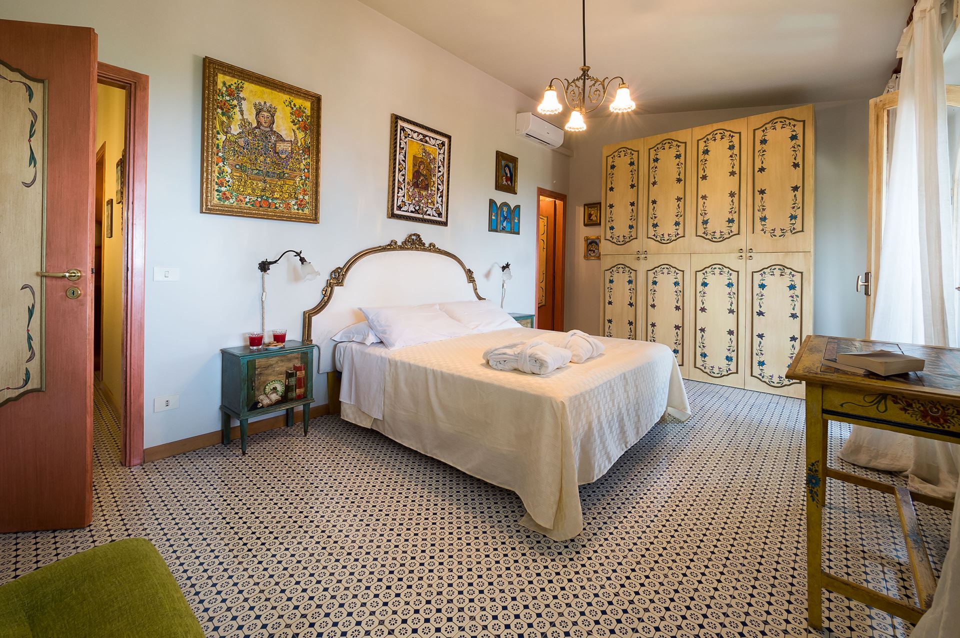 Indretningen af den store villa er gennemført og holdt i en meget karakteristisk siciliansk stil med brug af antikke møbler og bl.a. udsmykket med den traditionelle, sicilianske, keramik og kunst. Villaen er i to plan og har mange gode store stuer, herunder en stue med en stor tv-skærm med projektor. Villaen har alle moderne faciliteter såsom Wi-Fi, satellit-tv, vaskemaskine, opvaskemaskine og centralvarme. Alle soveværelser har eget badeværelse og aircondition.