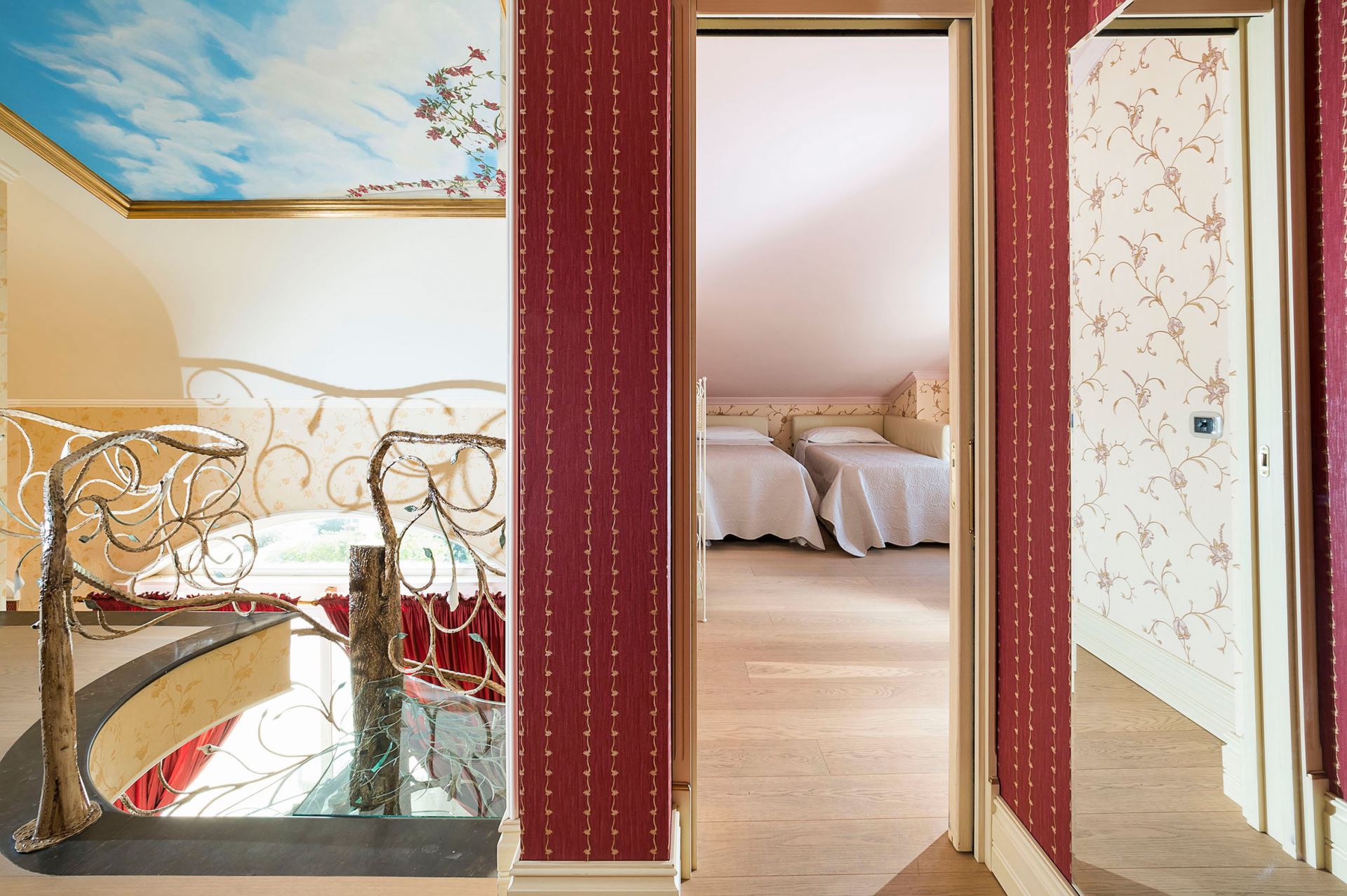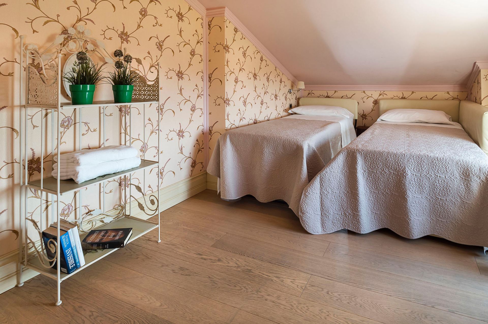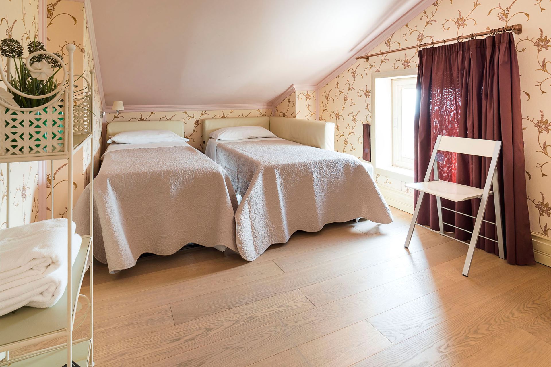 På første sal, som man kommer til via en imponerende ekstern dobbelt rampetrappe, har man en elegant stue med pejs og to soveværelser og et badeværelse. På anden sal (mandsard) ligger yderligere to soveværelser og et badeværelse.