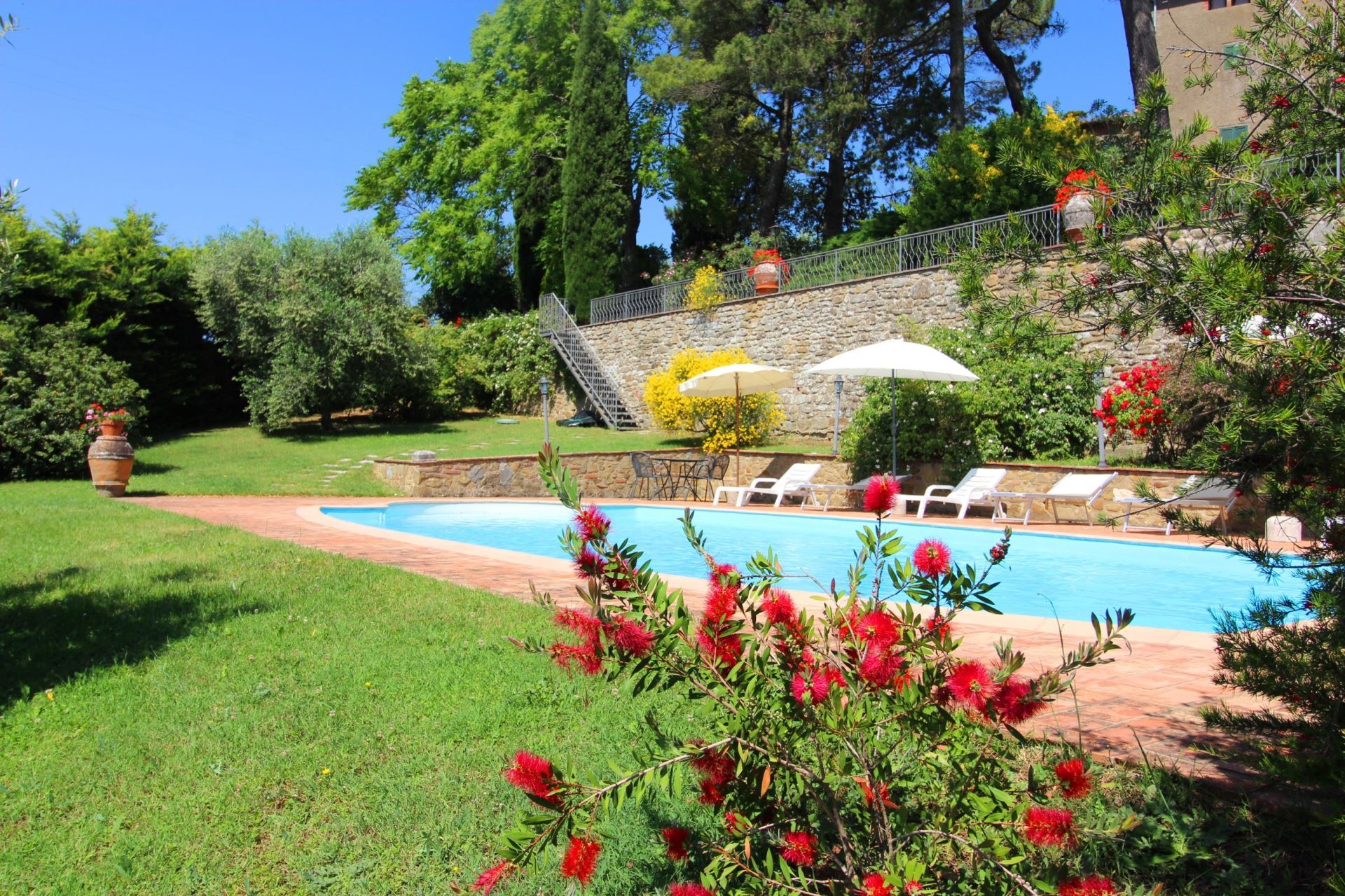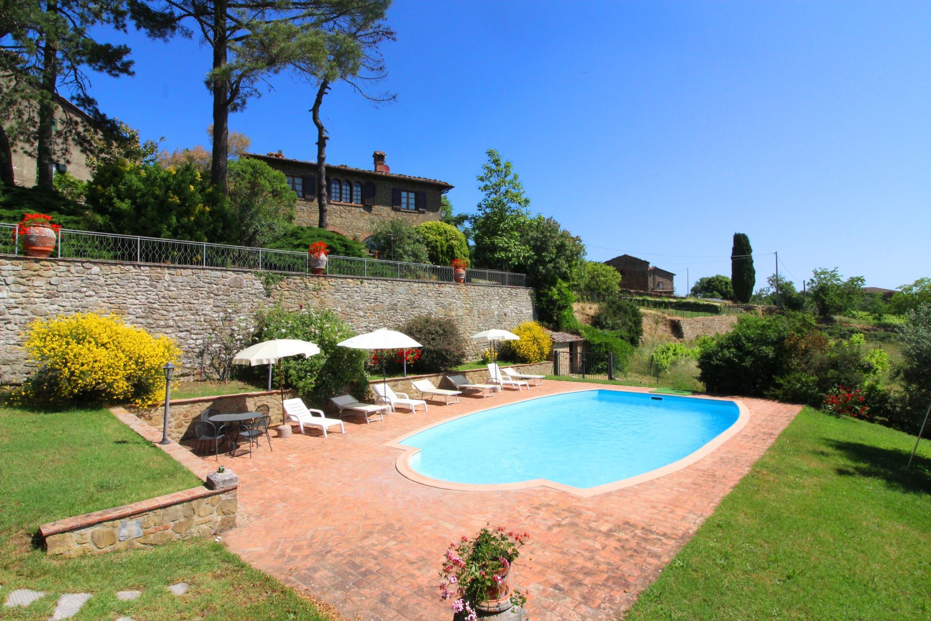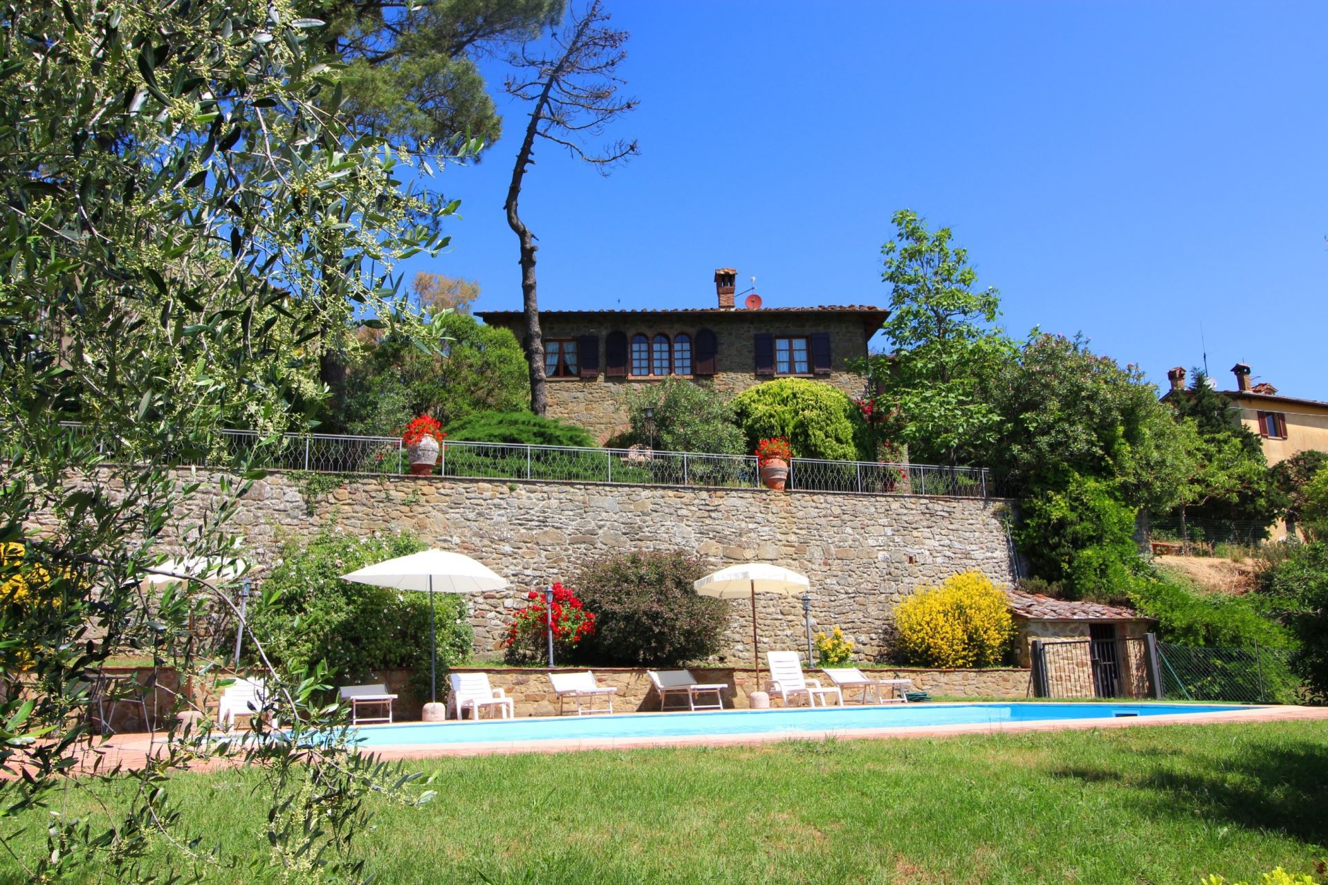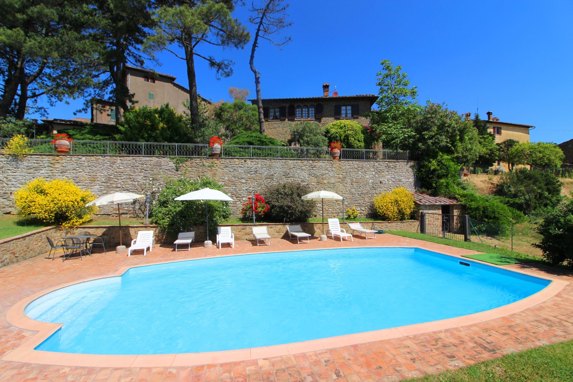 Palazzolo Alto ligger i en stor velplejet have med mange træer, buske og blomster i krukker samt en flot udsigt over det meget karakteristiske toscanske landskab med vinmarker, grønne skovområder og oliventræer. Et niveau nede finder man villaens private swimmingpool (størrelse 12 x 6 meter, dybde 1,00-1,40 m, fuldt indhegnet - åben fra 17. maj til 30. september). Det vil være muligt at få tilberedt en god lokal, toscansk middag af en kok, hvis man en eller flere dage ønsker det (mod tillæg på forespørgsel).