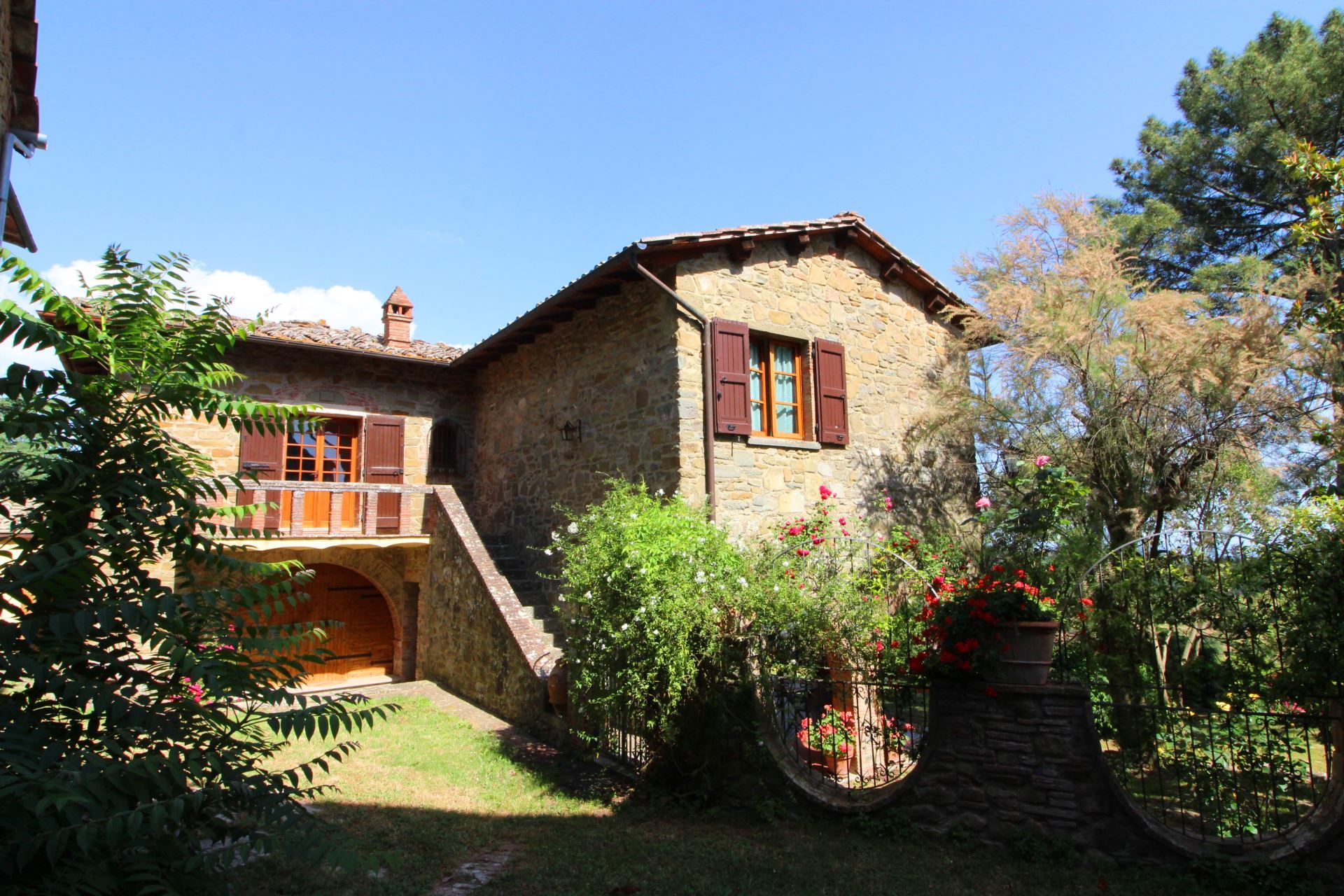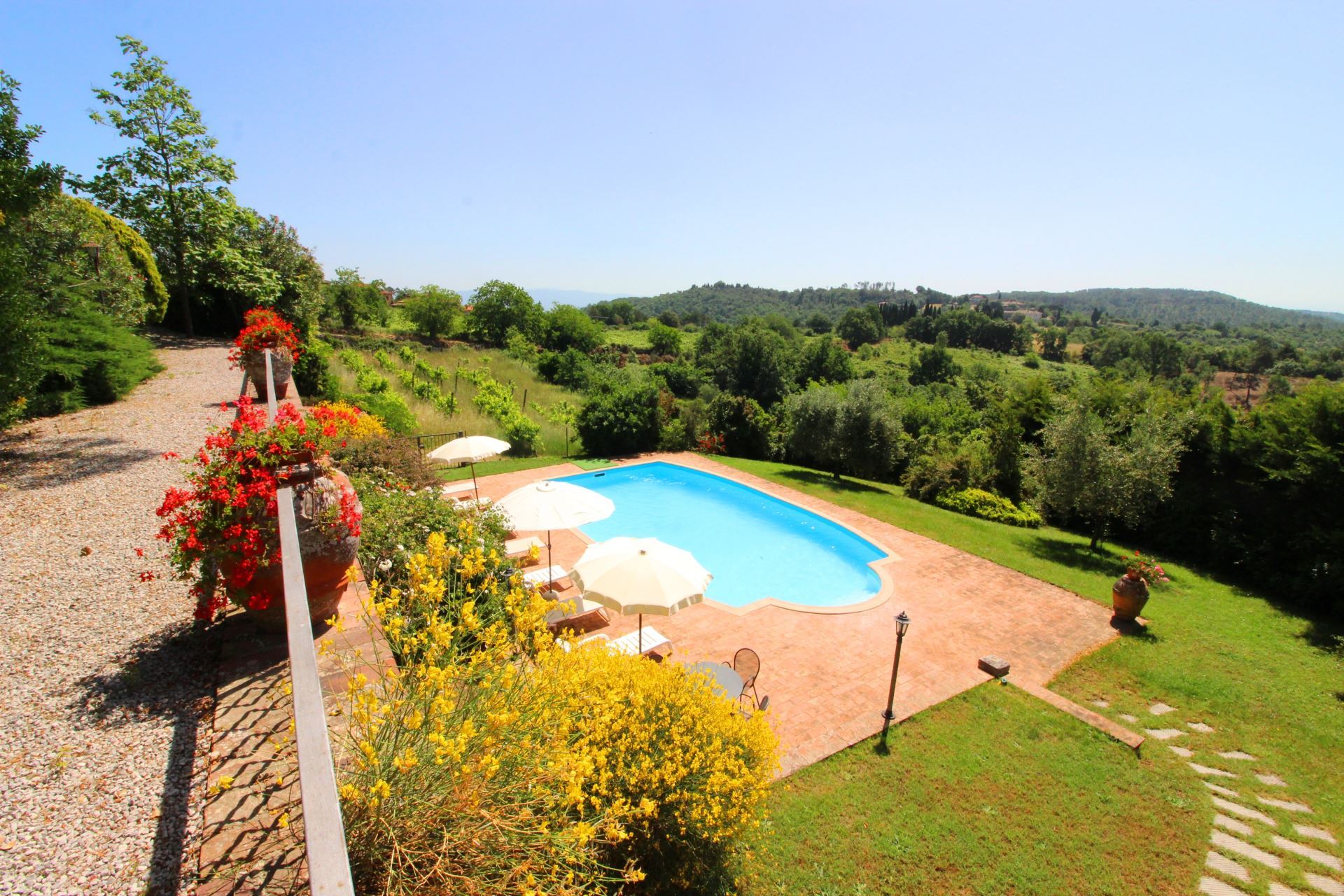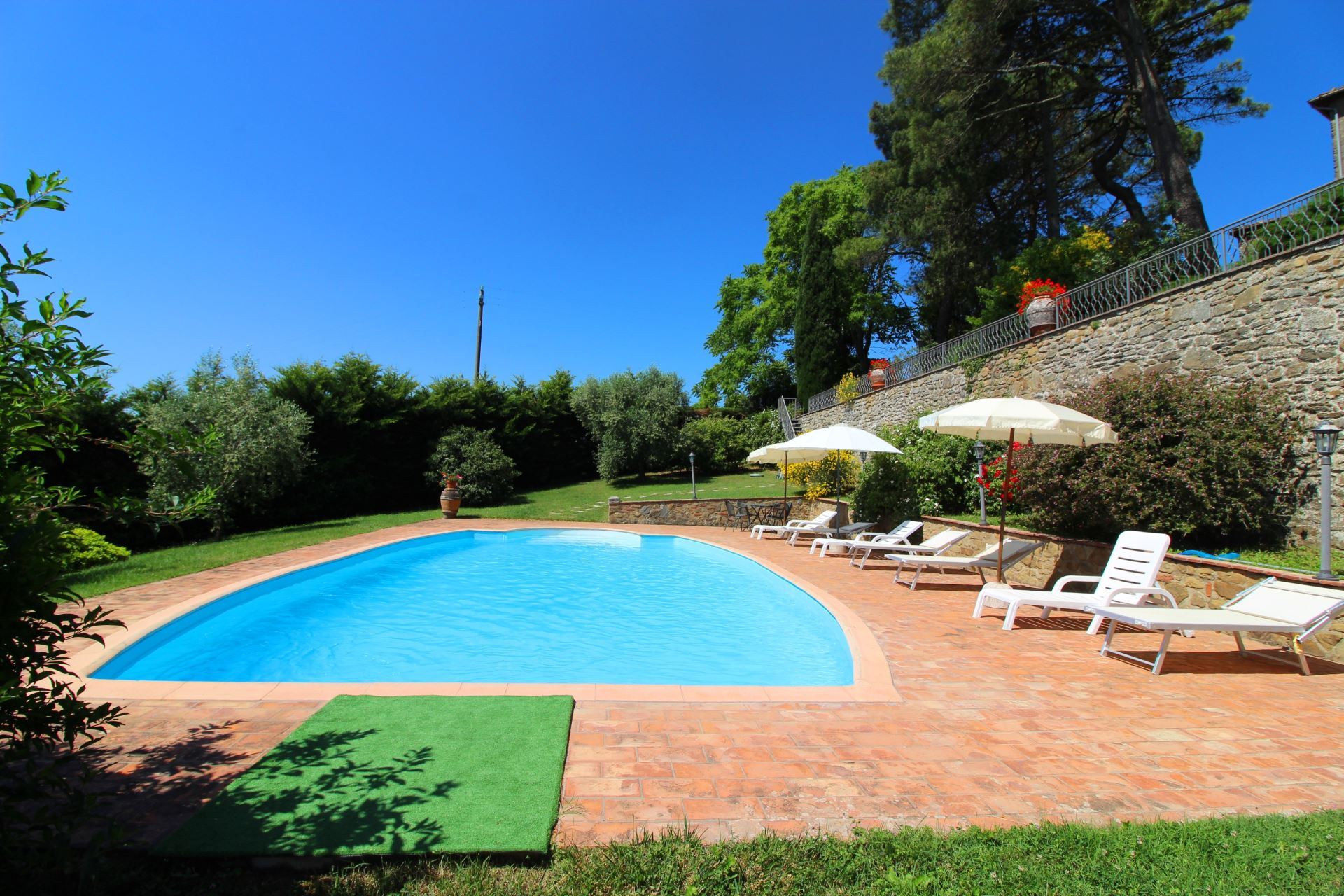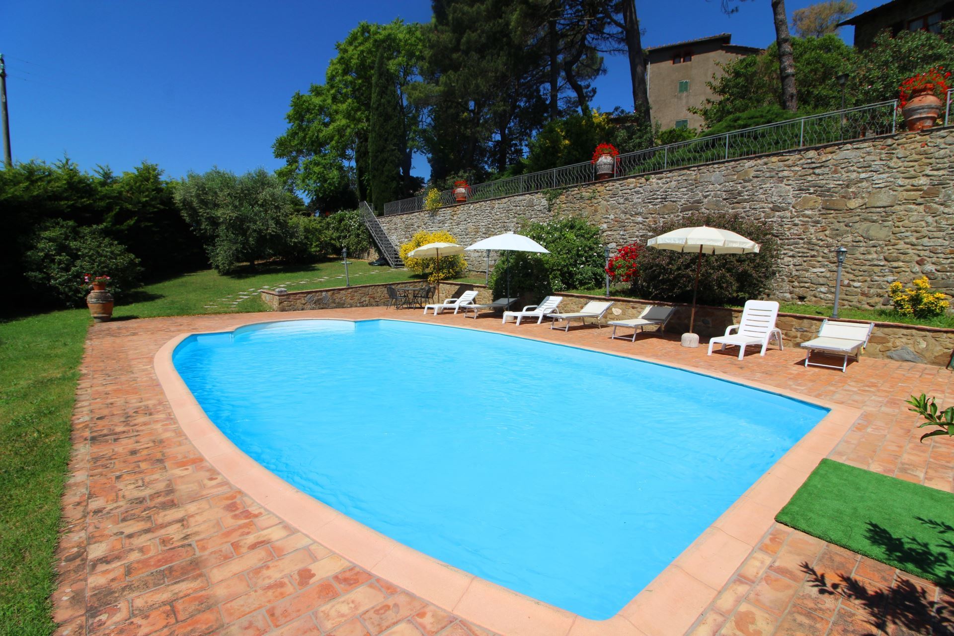Palazzolo Alto ligger i en stor velplejet have med mange træer, buske og blomster i krukker samt en flot udsigt over det meget karakteristiske toscanske landskab med vinmarker, grønne skovområder og oliventræer. Et niveau nede finder man villaens private swimmingpool (størrelse 12 x 6 meter, dybde 1,00-1,40 m, fuldt indhegnet - åben fra 17. maj til 30. september). Det vil være muligt at få tilberedt en god lokal, toscansk middag af en kok, hvis man en eller flere dage ønsker det (mod tillæg på forespørgsel).