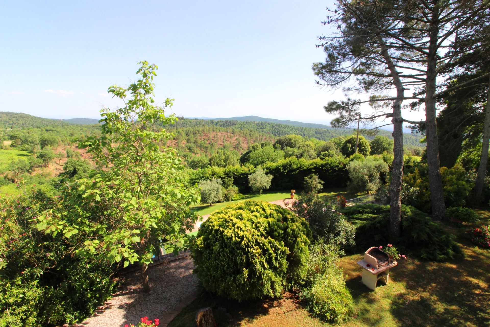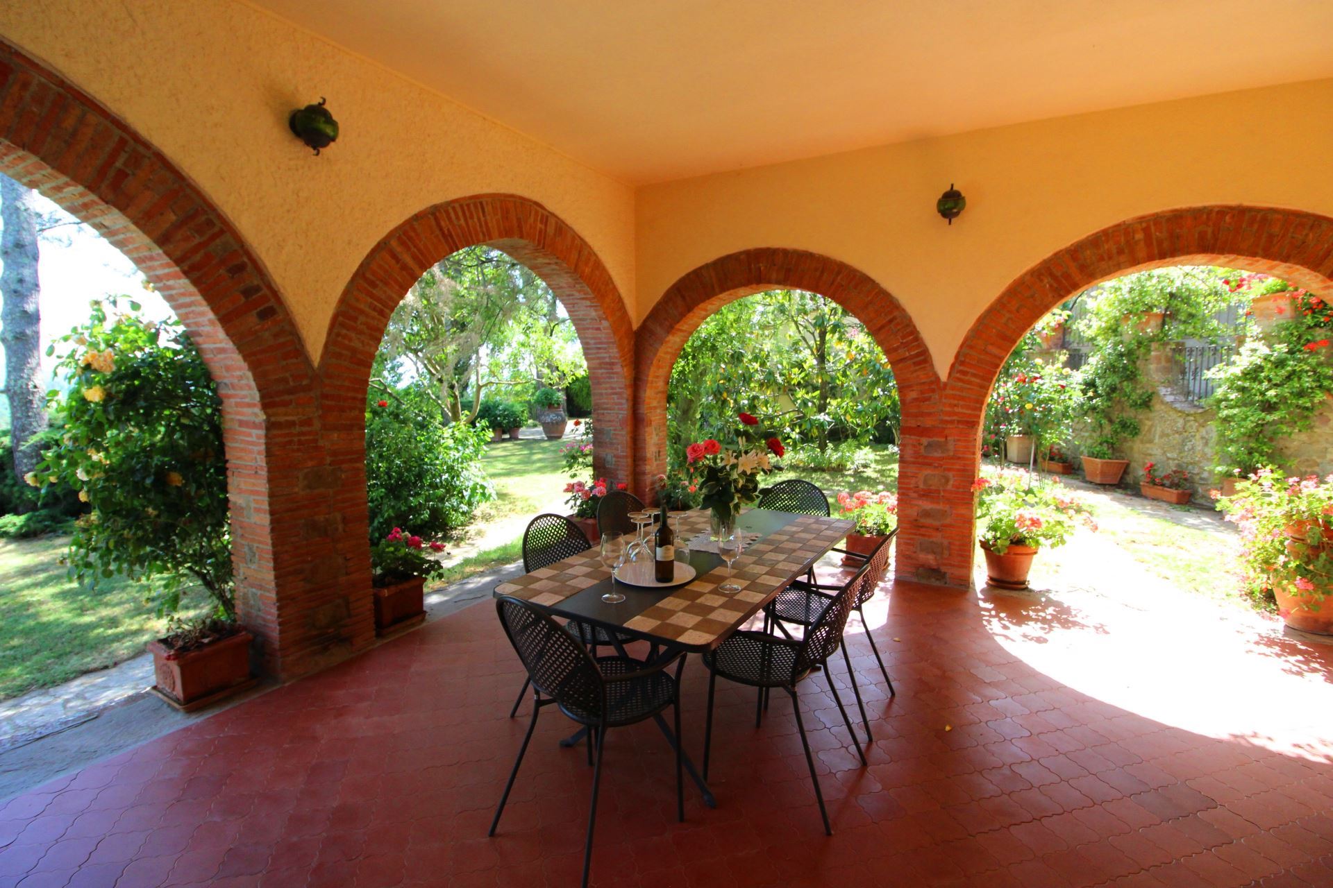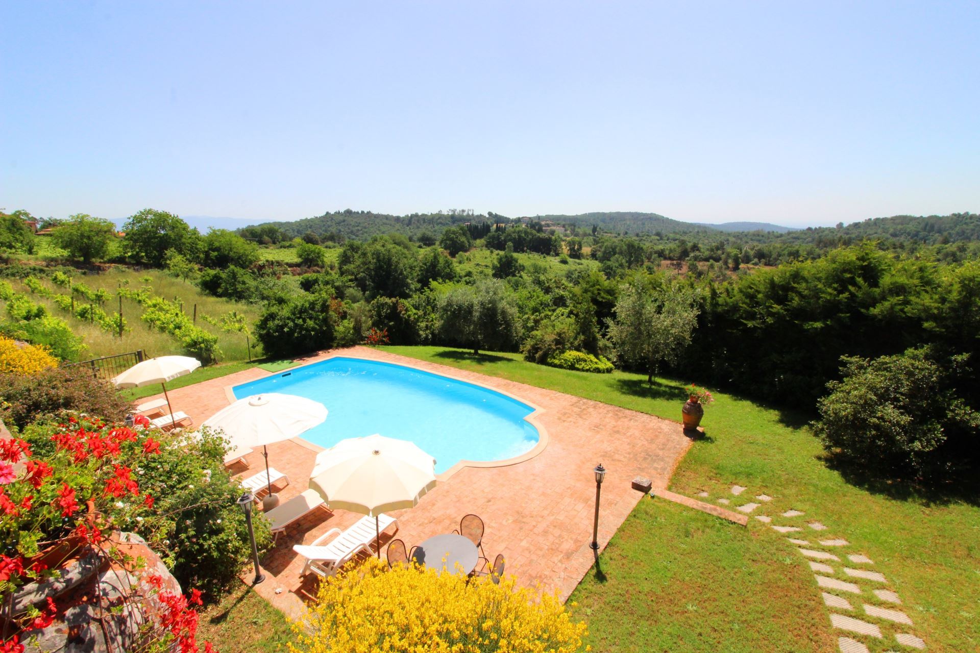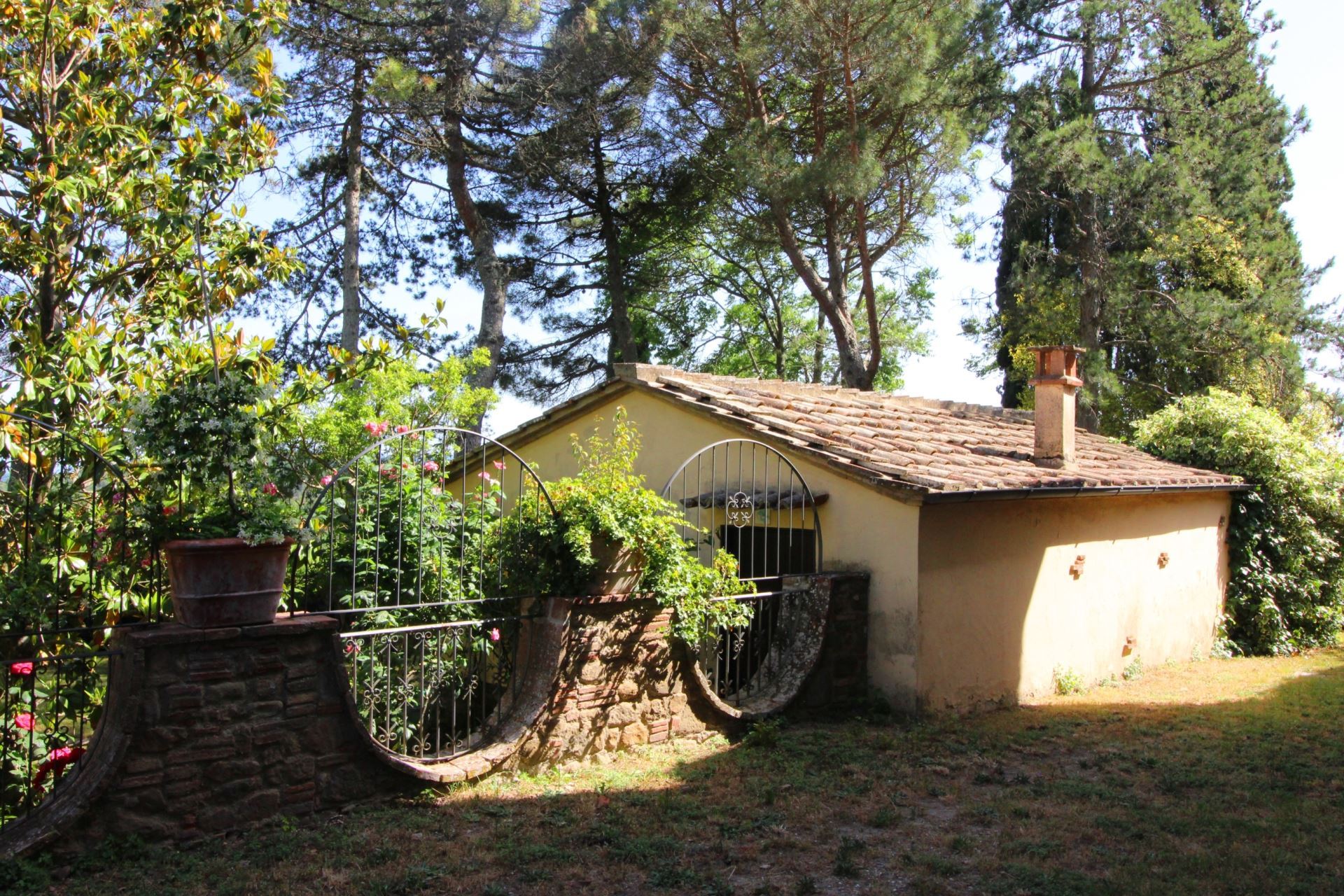Palazzolo Alto ligger i en stor velplejet have med mange træer, buske og blomster i krukker samt en flot udsigt over det meget karakteristiske toscanske landskab med vinmarker, grønne skovområder og oliventræer. Et niveau nede finder man villaens private swimmingpool (størrelse 12 x 6 meter, dybde 1,00-1,40 m, fuldt indhegnet - åben fra 17. maj til 30. september). Det vil være muligt at få tilberedt en god lokal, toscansk middag af en kok, hvis man en eller flere dage ønsker det (mod tillæg på forespørgsel).