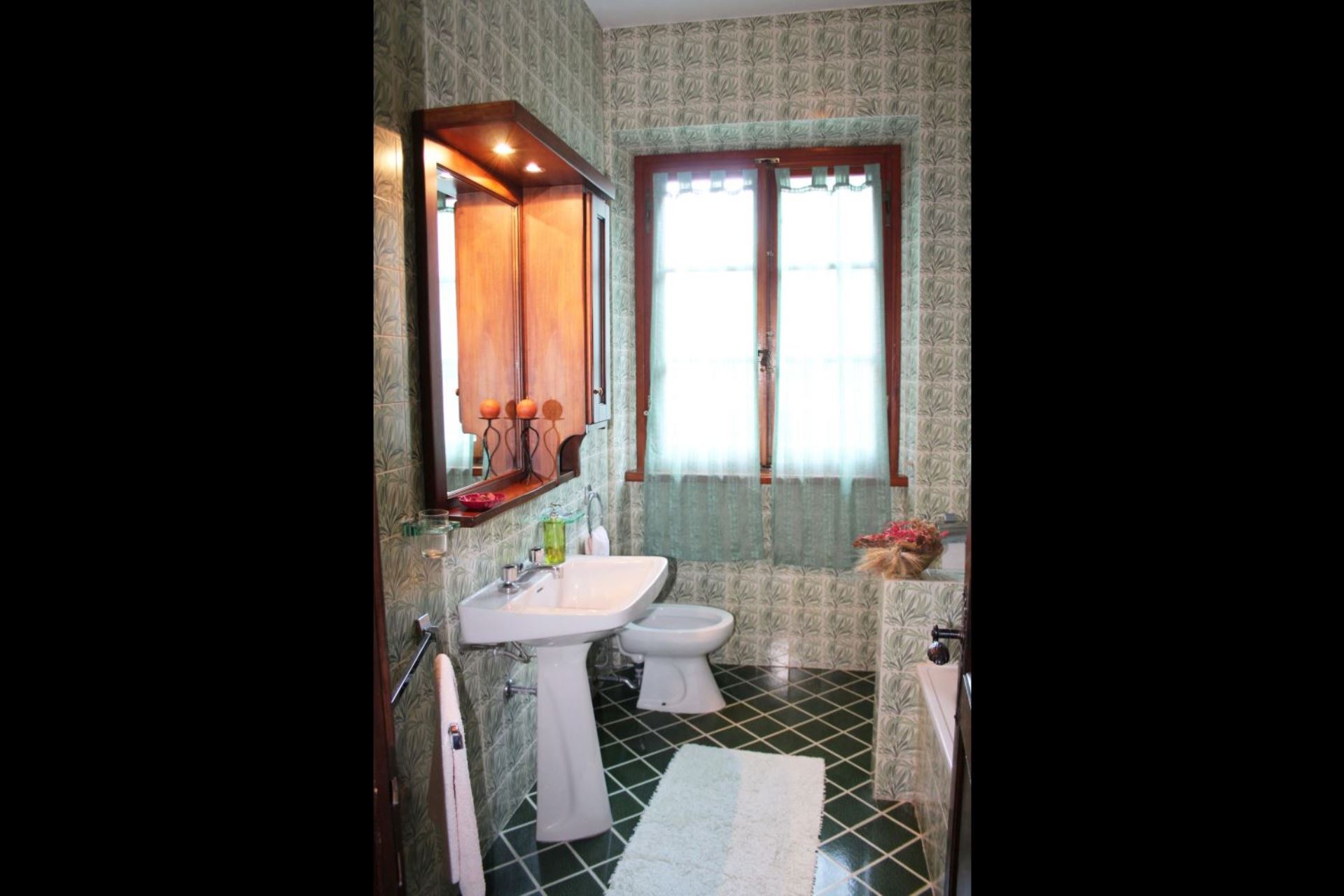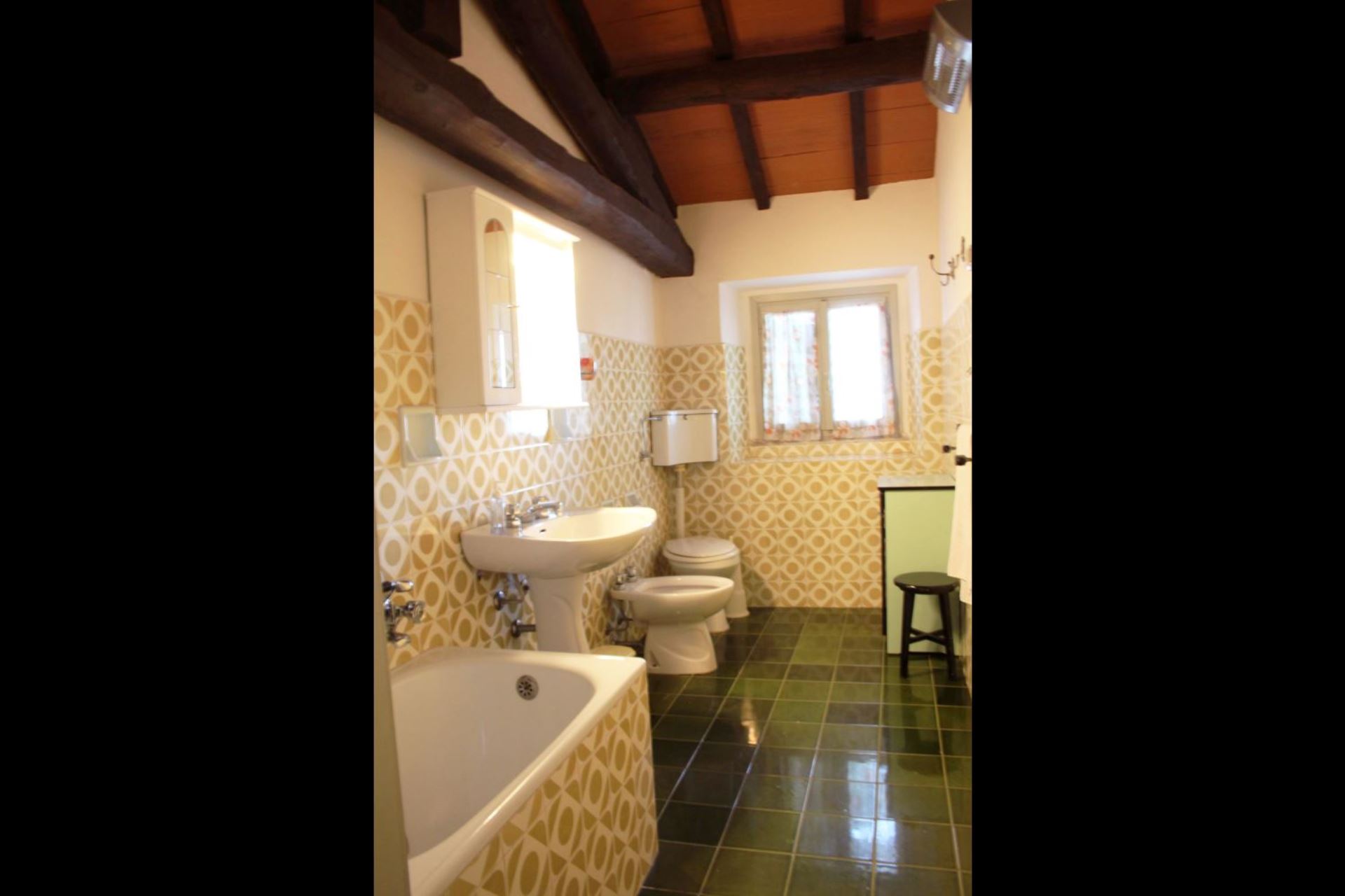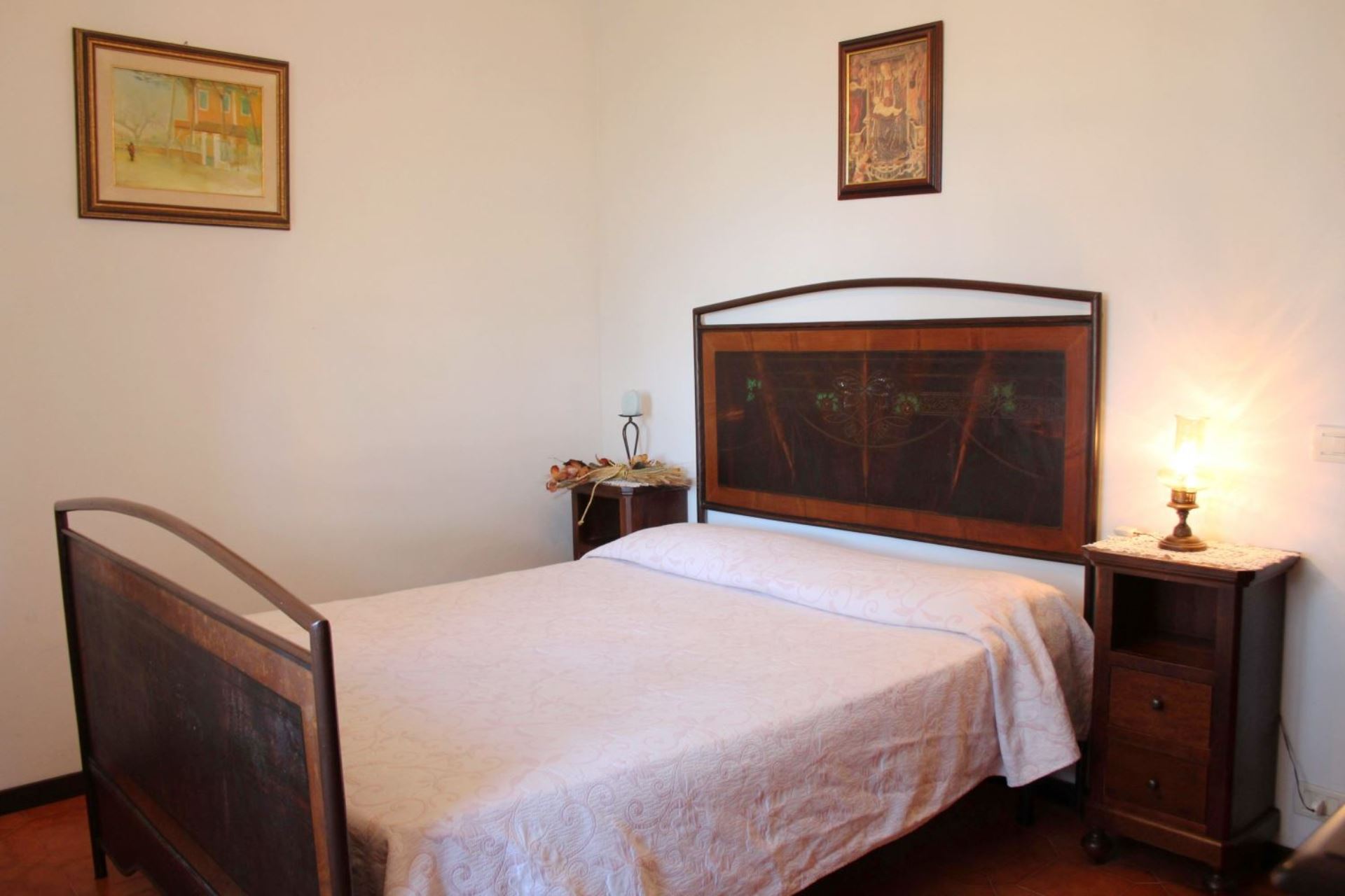 FØRSTE SAL: Tilgængelig både fra en udvendig stentrappe med en lille terrasse og fra en indvendig trappe, består den af en stue med pejs og sovesofa til to personer, soveværelse med dobbeltseng, soveværelse med dobbeltseng og privat badeværelse med bruser, værelse med to enkeltsenge med privat badeværelse med bruser, badeværelse med badekar.