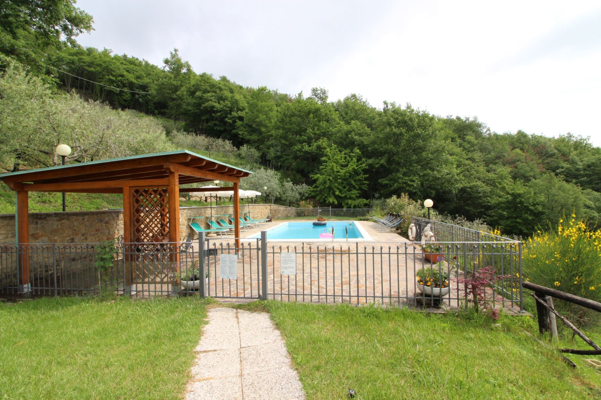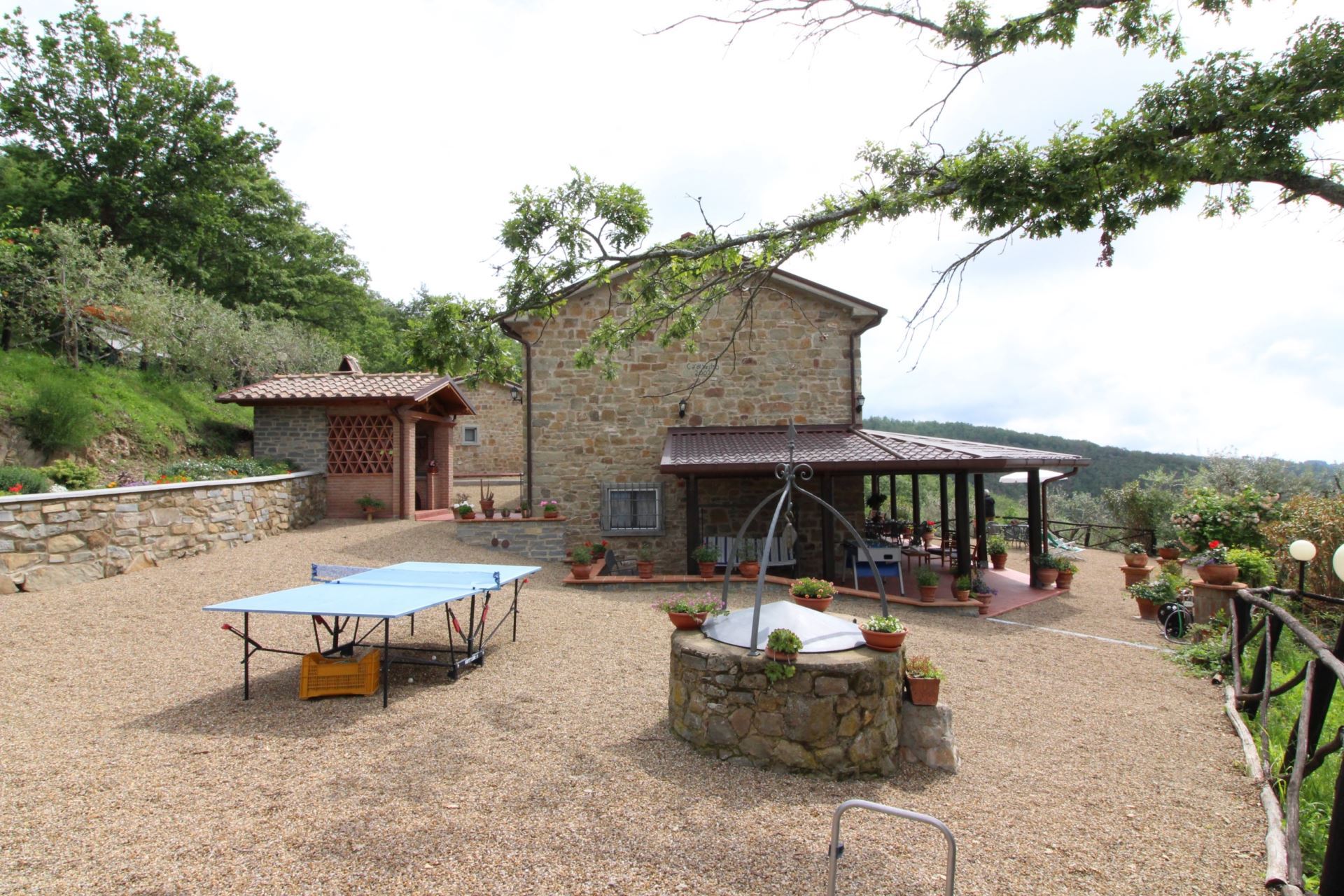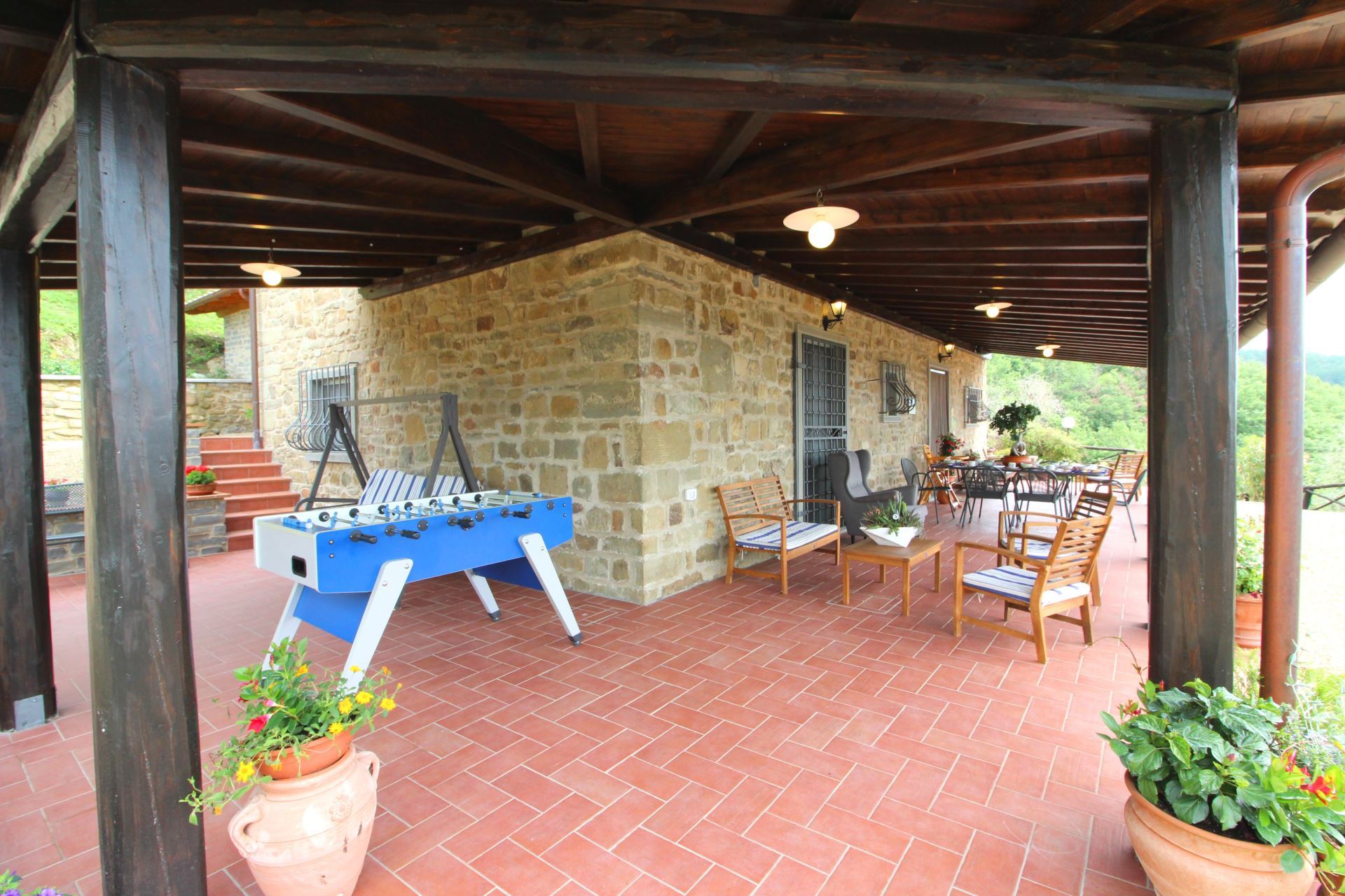 Villaen er omgivet af et stort indhegnet grønt område med havemøbler og mulighed for at arrangere bordtennis- og bordfodboldturneringer. Huset har desuden en god, stor overdækket terrasse, hvor man kan sidde og få et glas lokal vin eller en middag i det fri med typiske produkter, som bl.a. kan købes hos ejerne. Den fuldt indhegnede swimmingpool (5x10 m, dybde 1,40 m - åben fra 1. maj til 30. september) ligger på en naturlig terrasse med pavillon, solstole og parasoller samt en flot udsigt over dalen.