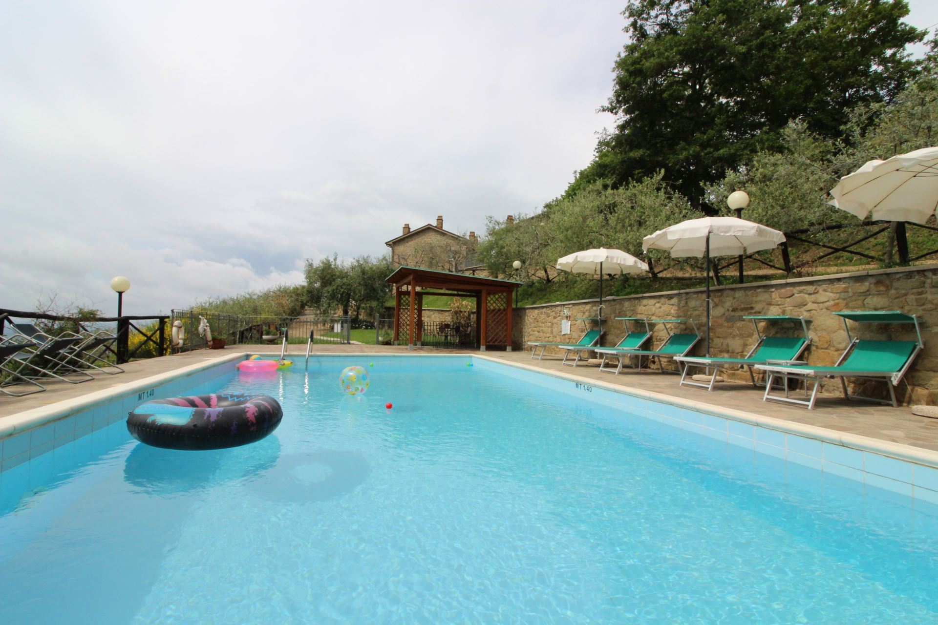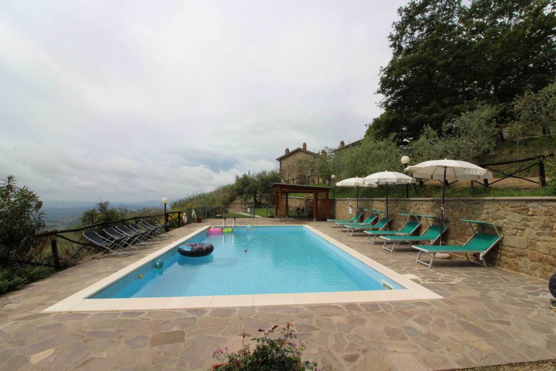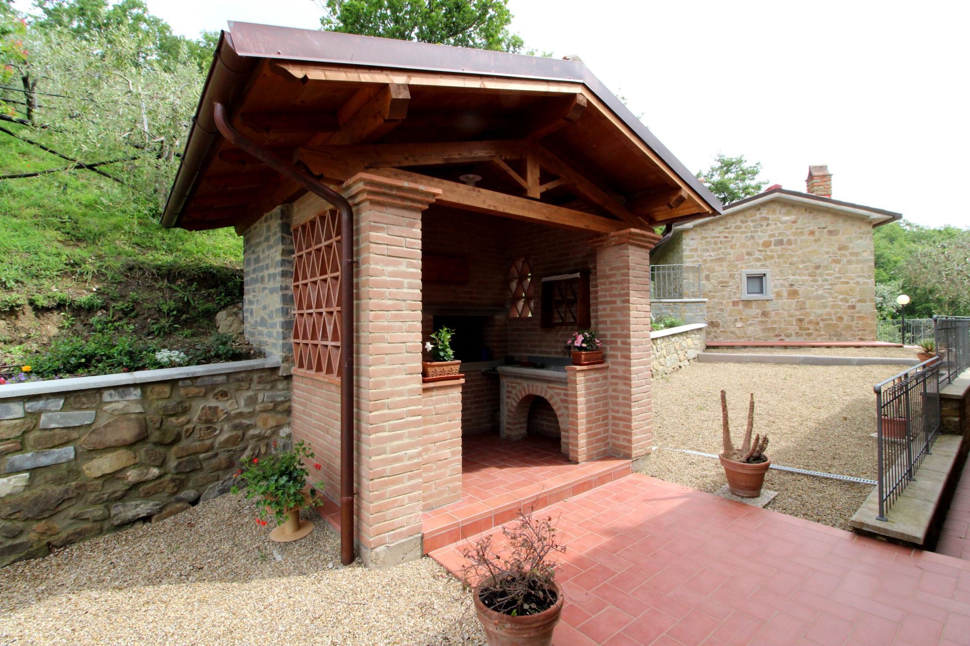 Villaen er omgivet af et stort indhegnet grønt område med havemøbler og mulighed for at arrangere bordtennis- og bordfodboldturneringer. Huset har desuden en god, stor overdækket terrasse, hvor man kan sidde og få et glas lokal vin eller en middag i det fri med typiske produkter, som bl.a. kan købes hos ejerne. Den fuldt indhegnede swimmingpool (5x10 m, dybde 1,40 m - åben fra 1. maj til 30. september) ligger på en naturlig terrasse med pavillon, solstole og parasoller samt en flot udsigt over dalen.
