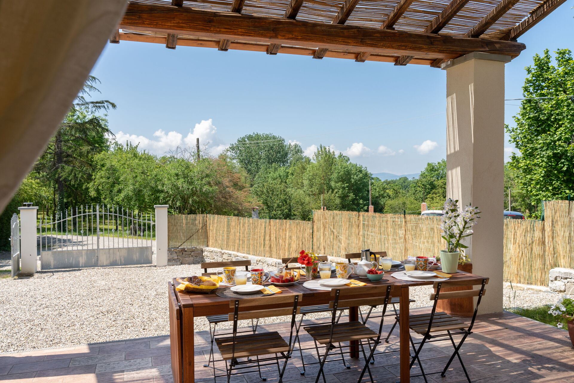 Overdækket loggia til udendørs frokost og middag med adgang fra spisestuen.