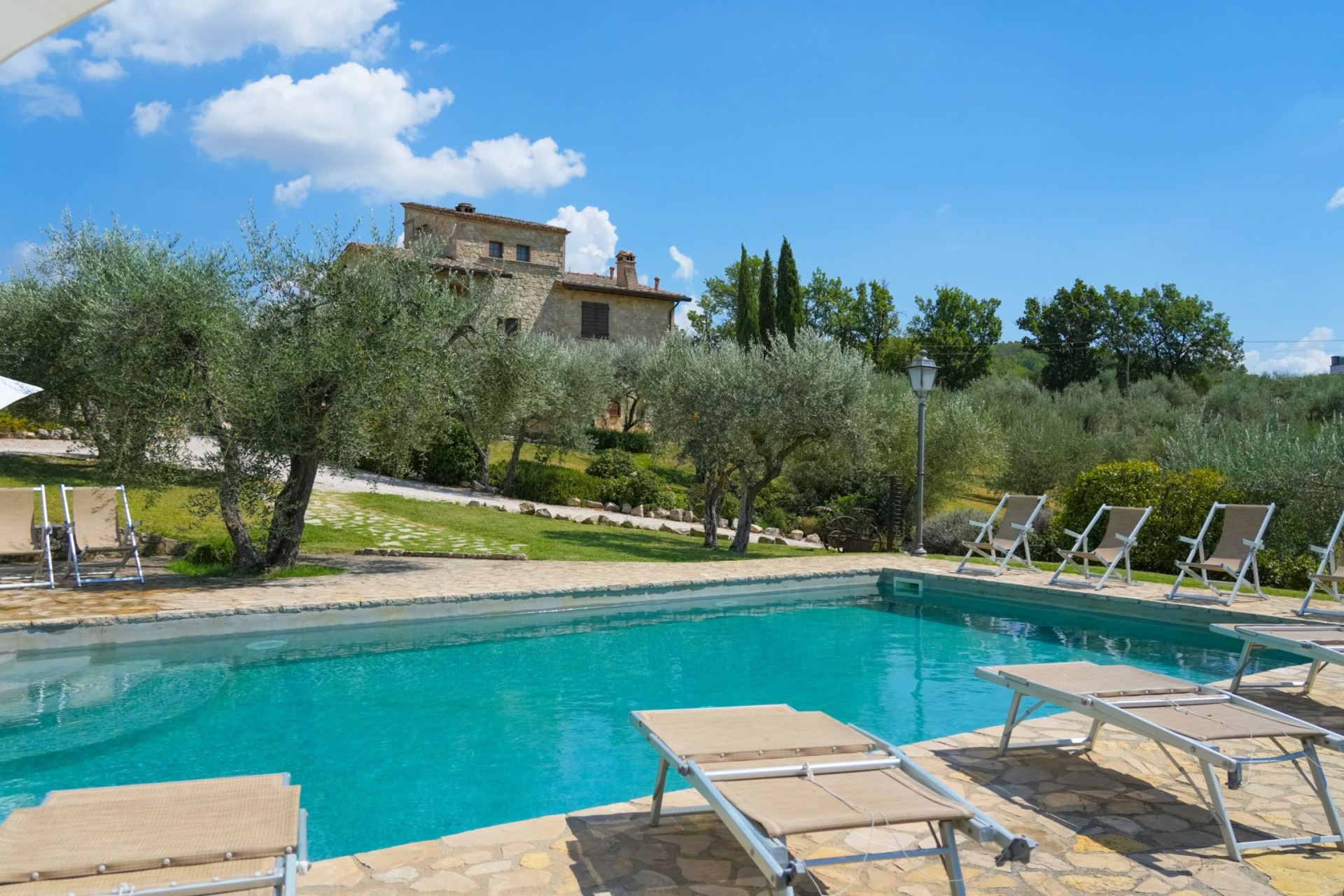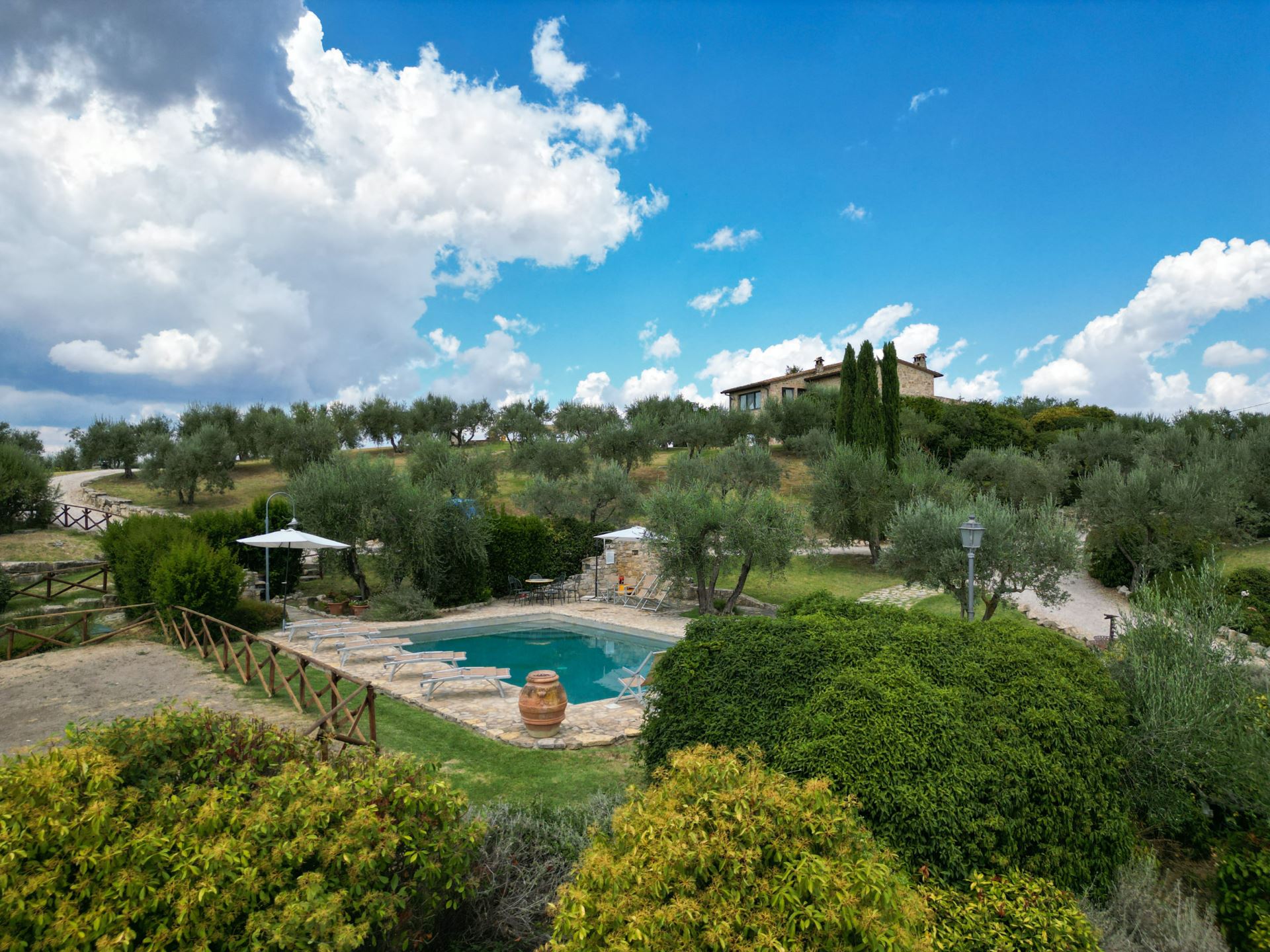 Umbrisk luksus-landhus i sten med stor privat pool og aircondition til 10+1 personer i området syd for Perugia i det centrale Umbrien med mange muligheder for udflugter både i nærområdet og for dagsture. Villaen har adgang til et velindrettet fitnesscenter med sauna.